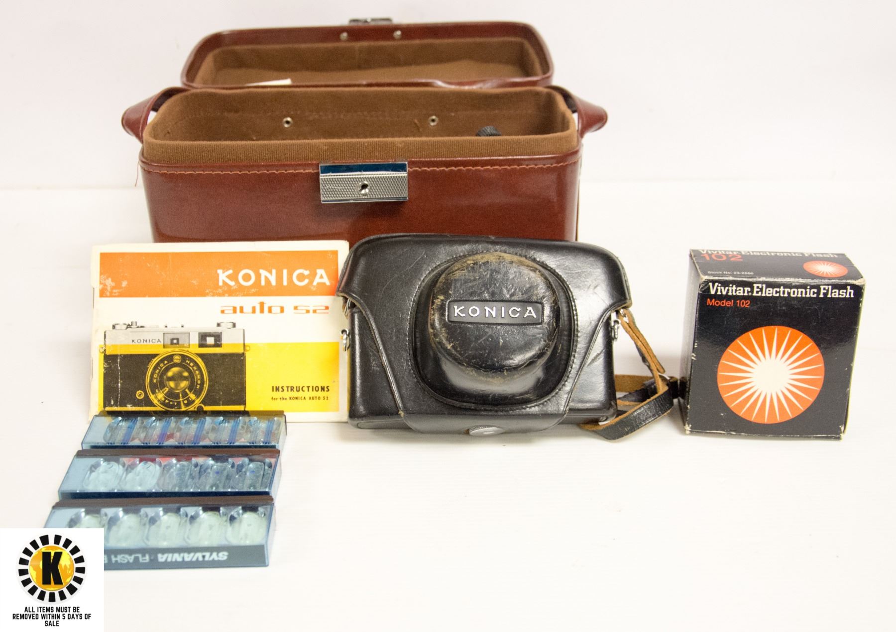 VINTAGE KONICA CAMERA WITH CASE AND ACCESSORIES