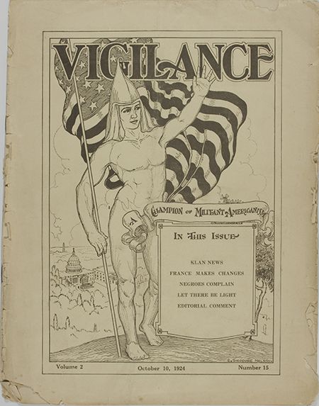 A copy of the Ku Klux Klan publication Vigilance, ("Champion of Militant Americanism"), Oct. 10, 1924, 8pp. 4to. The cover bears an image of a hooded, but otherwise naked, Klansman standing on a mountain above the White House. Articles within include: "Klan News", "Negroes Complain" and "Let there be Light" - all of which contain the predictable Klan rhetoric and content. Vigilance identifies itself as: "Dedicated to the promulgating of the distinctive and worthy principles of the Knights and Women of the Ku Klux Klan; to unflinchingly challenge any influence detrimental to the welfare of peoples within our National borders, to promote a Brotherhood of Man...". Split at spine, wear to edges, in need of restoration, still good.