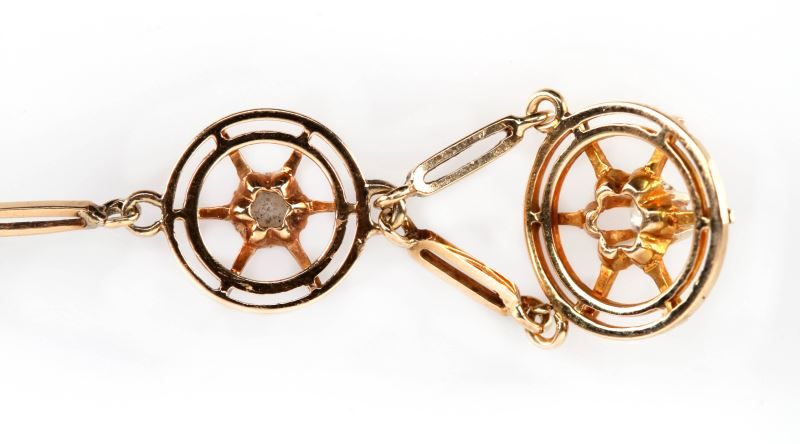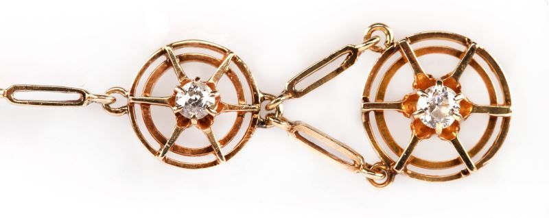 Beautifully simple, high-labor, hand-assembled piece, Art Deco design and styling,containing two round obsolete European cut diamonds, one weighing approximately .20ct, and one weighing approximately .13ct, for an approximate total diamond weight of .33cts, graded G/VS2. Weight: 1.5 without chain. Condition: Excellent.