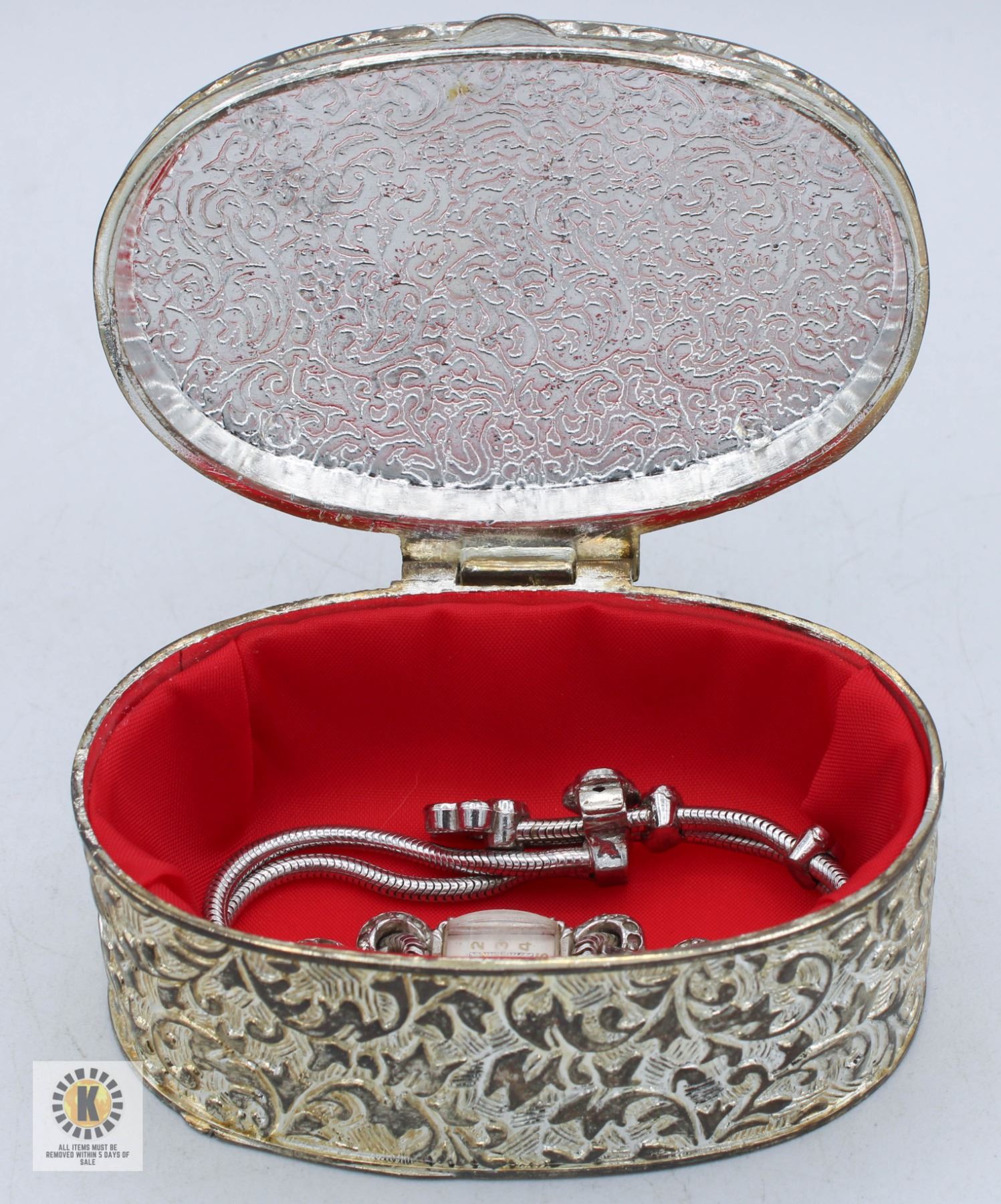 IN DECORATIVE METAL SILVER STORAGE CASE **ALL ITEMS MUST BE REMOVED BY 5PM SATURDAY, APRIL 3RD 2025. ALL REMAINING ITEMS WILL BE SUBJECT TO A $6.00 PER DAY STORAGE CHARGE. ANY ITEMS REMAINING AFTER MONDAY, MAY 19TH 2025 WILL BE CONSIDERED FORFEITED. NO REFUNDS WILL BE ISSUED FOR FORFEITED ITEMS. TO SCHEDULE A PICK UP APPOINTMENT CLICK HERE