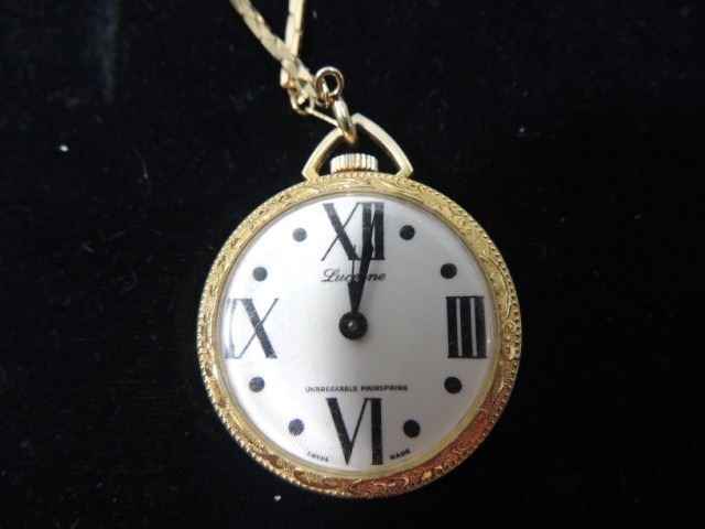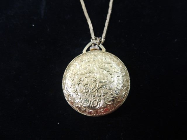 NICE LADIES PENDANT STYLE WATCH IN GOLDTONE. WORKING WATCH WITH CHAIN. UNBREAKABLE MAINSPRING. SWISS MOVEMENT. AS SHOWN.