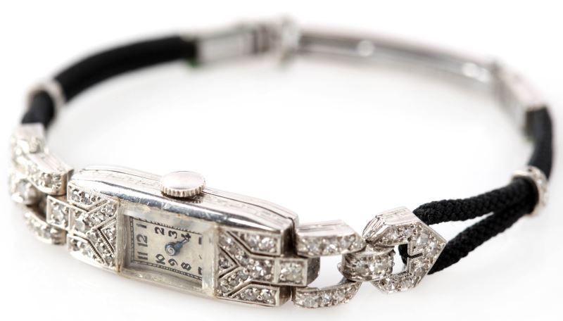 Extreme high labor piece, hand engraved, hand coin edging, platinum case, hinged back and ear-lug pieces, containing 62 round, single cut diamonds, with an approximate total diamond weight of 1.25cts, graded F-G/VS1; all bead set. Movement manufactured by Perfine, Swiss manual 17j movement. Movement: 17J SWISS MANUAL WIND Case: PLATINUM Band: BLACK CORD Face, Dial, Hands: WHITE DIAL, BLACK HANDS Weight: 16.1 Condition: VINTAGE; RUNS WELL, NO IMPLIED WARRANTY