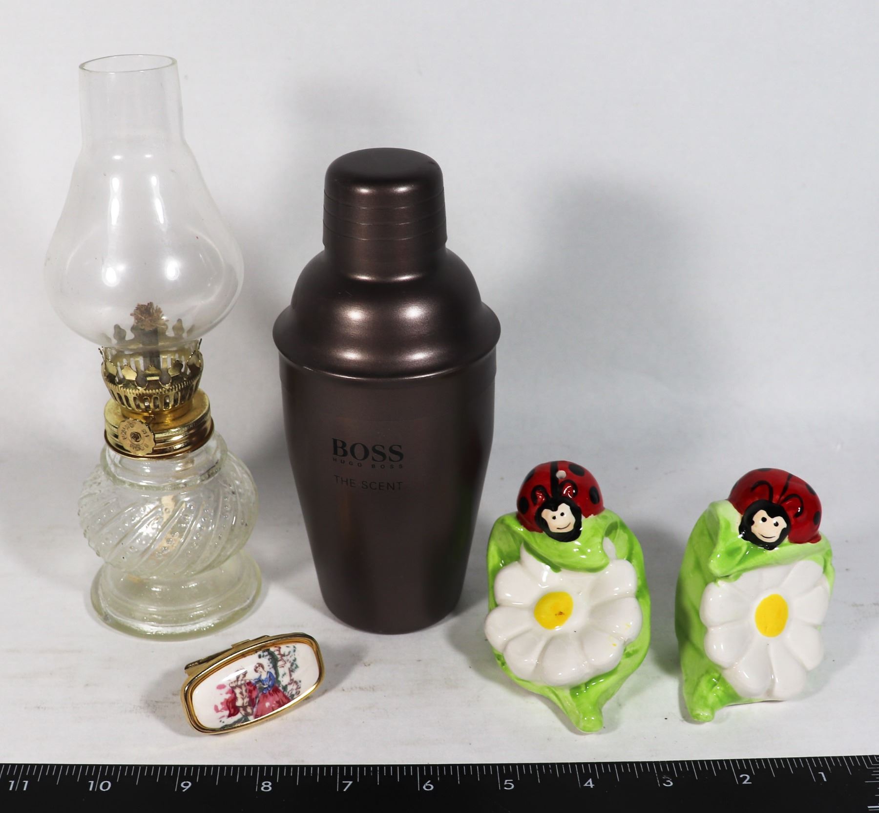 WITH HUGO BOSS EMPTY CONTAINER, MIRROR RING, AND MINI HURRICANE LAMP