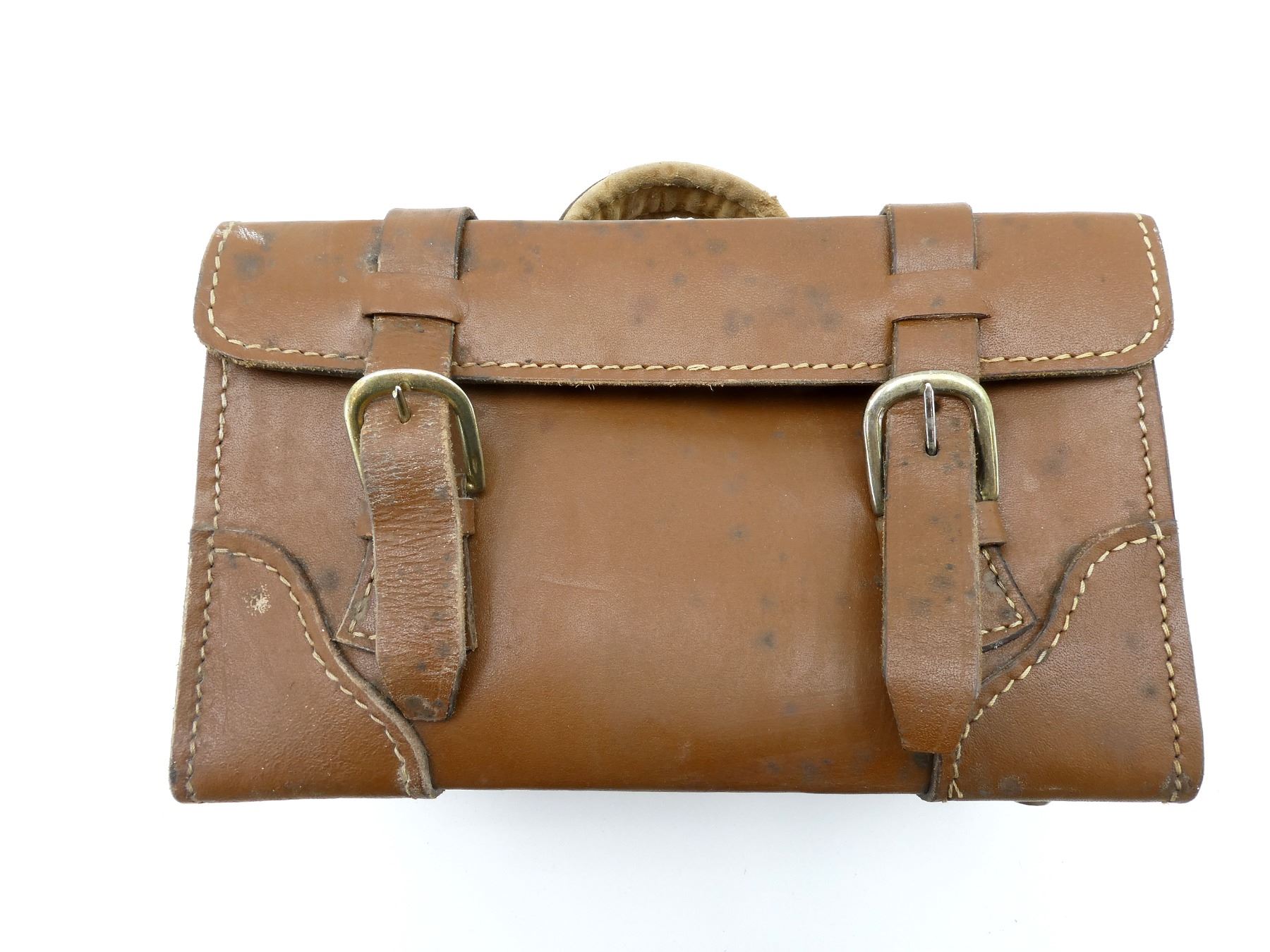 (1) BROWN LEATHER CONSTRUCTION, UNMARKED, BUCKLE CLOSURE & CARRY HANDLE, SHOWS WEAR & TEAR / USE MARKS, OVERALL LENGTH APPROX. 11.25" X 6" X 6.25". SEE PHOTOS.