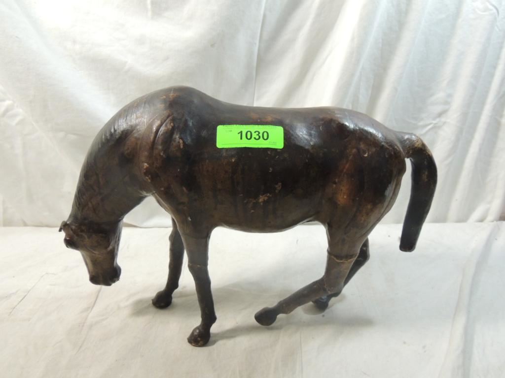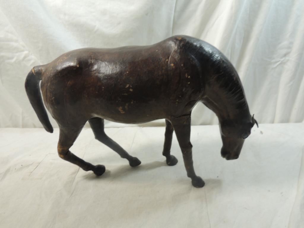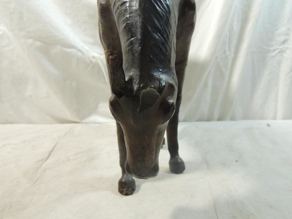 HORSE FIGURE, HORSE STATUE, HORSE SCULPTURE, VINTAGE LEATHER HORSE, DECORATIVE HOME DECOR, COLLECTIBLE, VINTAGE AS SHOWN SEE PHOTO FOR MORE DETAILS.