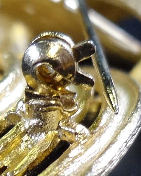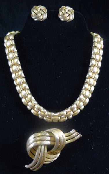 SIGNED ON ALL THREE PIECES. NECKLACE IS 16" LONG, BROOCH IS ALMOST 3" LONG. EARRING SHOW JUST A TINY-TINY-TINY BIT OF GREEN AT HINGE. VERY NICE WEARABLE VINTAGE SET!