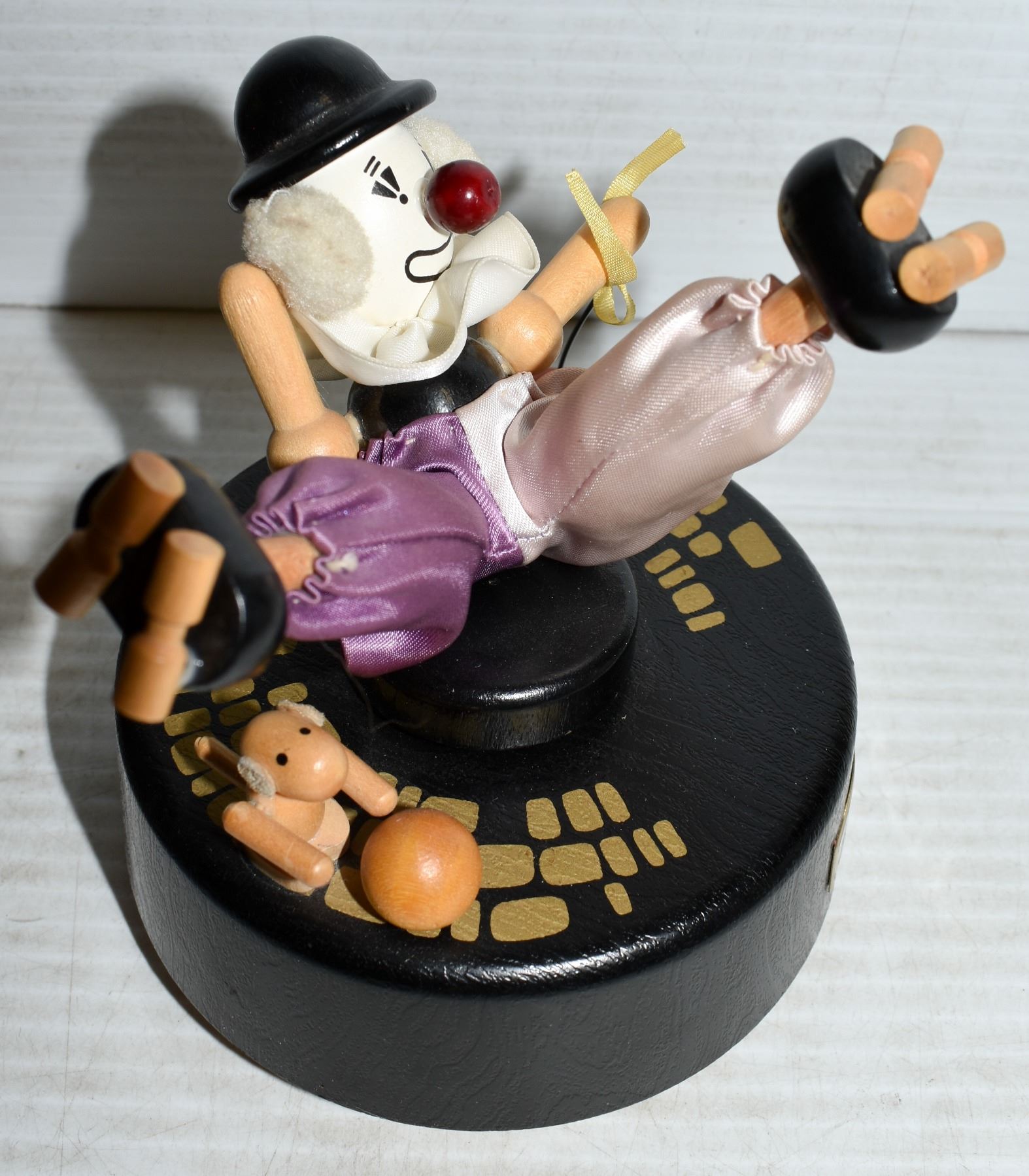 VINTAGE COLLECTIBLE LITTLE MELODY WIND-UP WOODEN MUSIC BOX - ROLLER SKATING CLOWN WITH BALLOON AND DOG. 5 INCHES TALL X 5.5 INCHES WIDE. COLLECTIBLE
