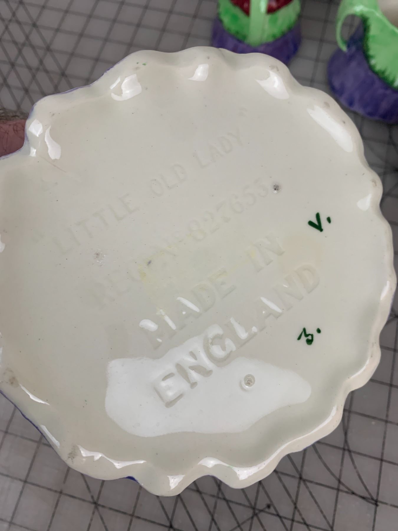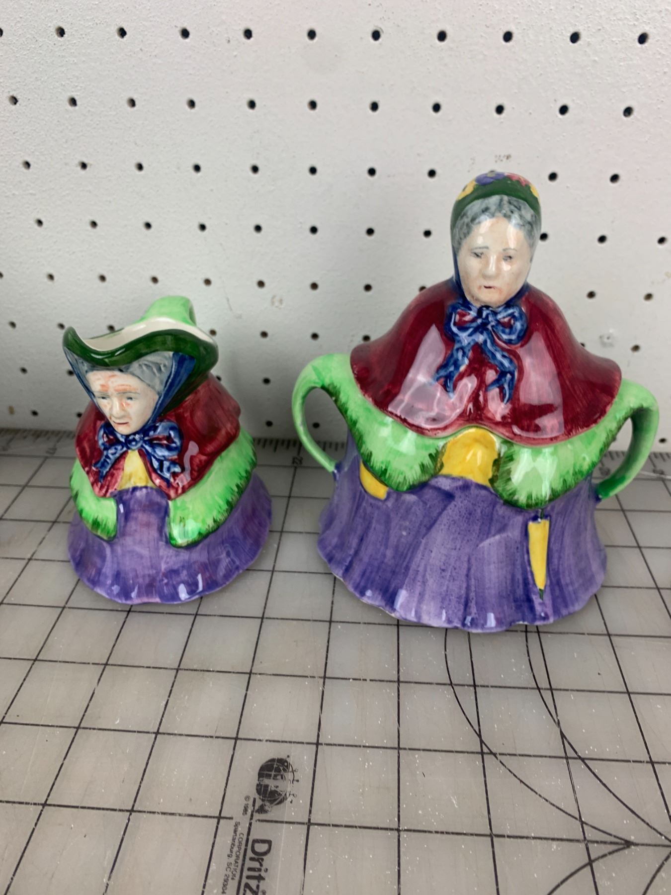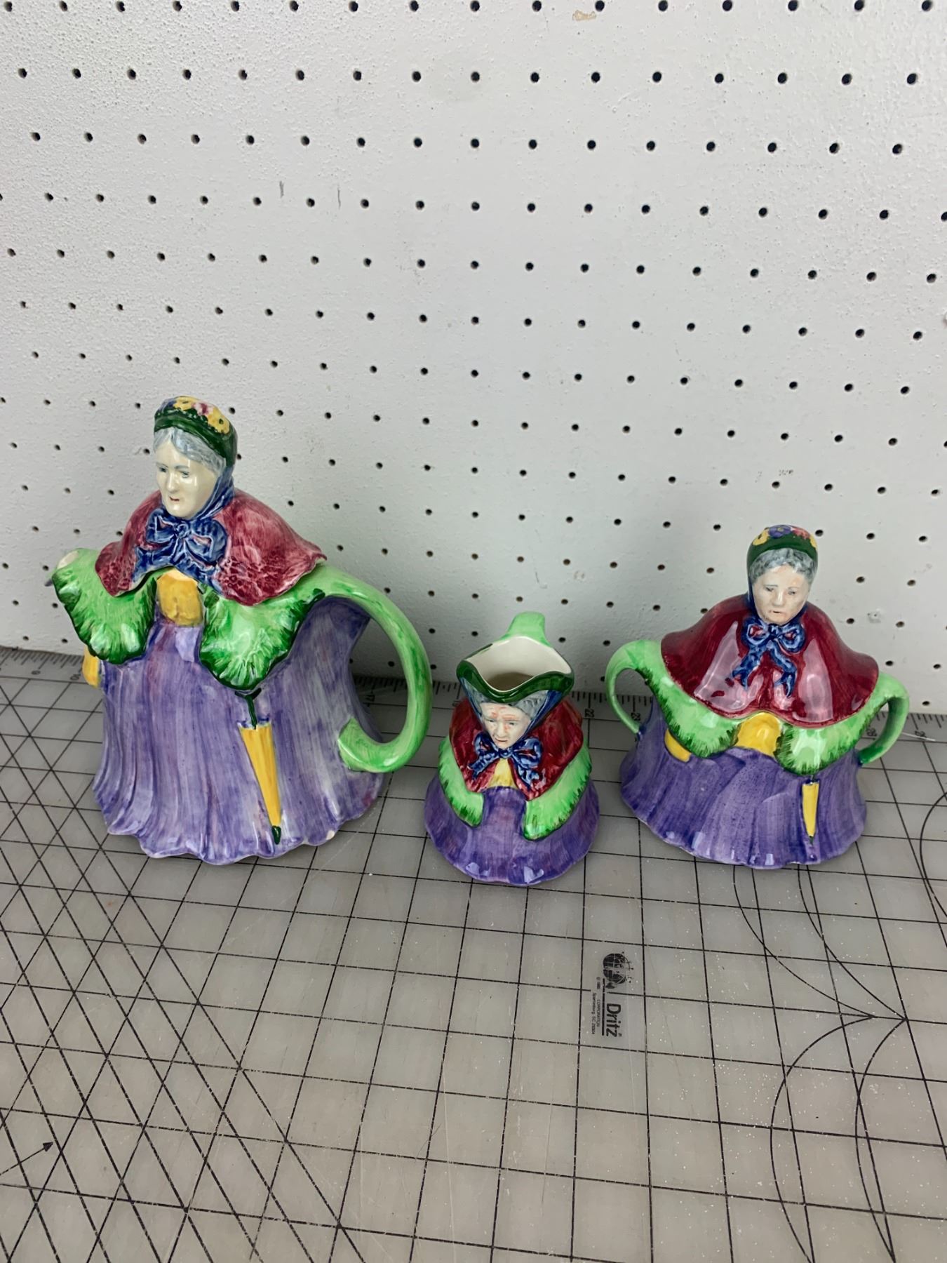 VINTAGE LITTLE OLD LADY ENGLAND TEA POT CREAM AND SUGAR SET