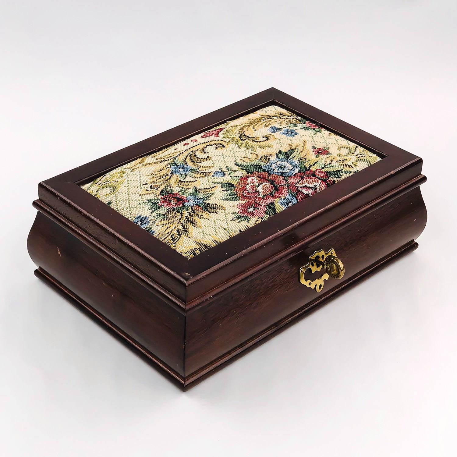 #9199 - FLORAL TAPESTRY LIDDED WOODEN JEWELRY BOX WITH LOCKING KEY. ORIGINAL KEY - LOCKS FINE. MEASURES: 12” (30.5 CM) LONG BY 8.25” (21 CM) WIDE AND 4” (10 CM) HIGH***ITEM(S) LOCATED IN LETHBRIDGE ALBERTA. ALL ITEMS IN THIS AUCTION QUALIFY FOR OUR FREE TRANSPORT TO EDMONTON SERVICE. WORLDWIDE SHIPPING AVAILABLE