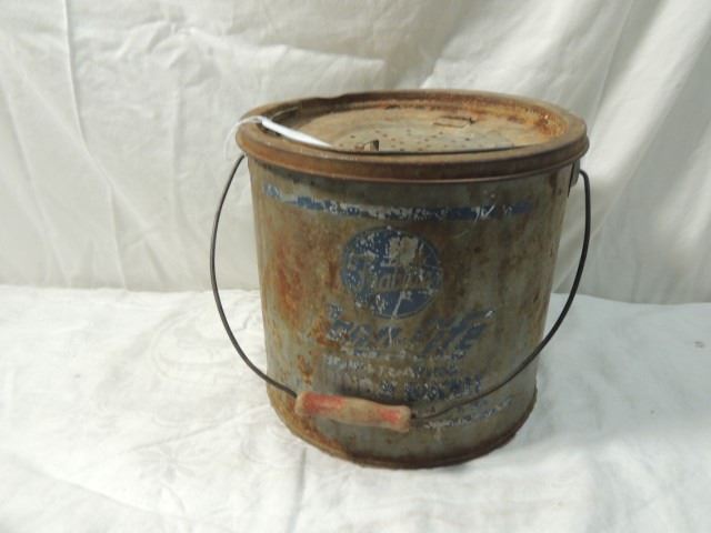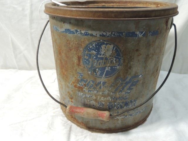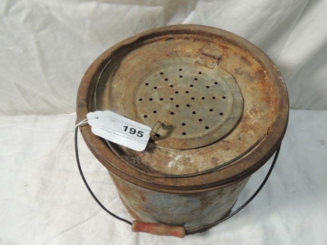 ANTIQUE PRIMITIVE METAL NON FLOATING MINNOW BUCKET WITH GRAPHICS, AS SHOWN.