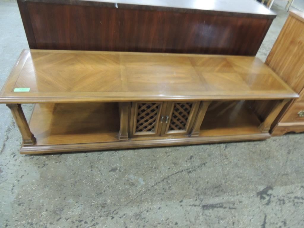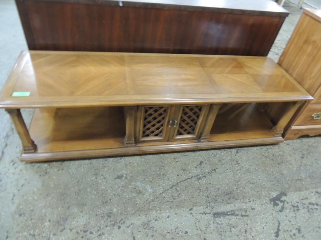 APPROX 65" LONG VINTAGE ENTERTAINMENT TABLE TV TABLE AS SHOWN SEE PHOTO FOR MORE DETAILS.