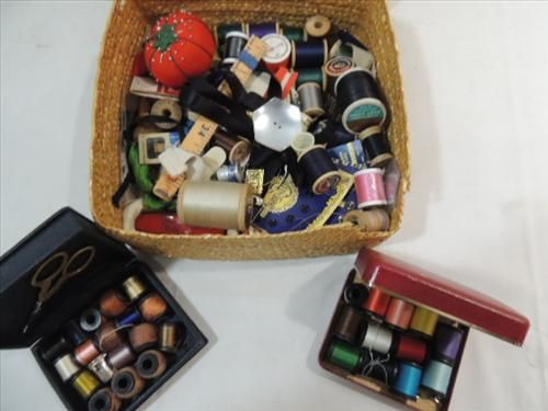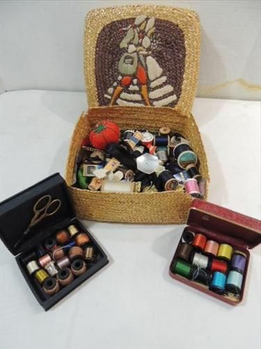 VINTAGE LOT ASSORTED SEWING SUPPLIES & WOVEN BASKET. NICE SELECTION OF THREAD NEEDLES AND MORE. AS SHOWN. VIEW PICTURE FOR DETAIL.