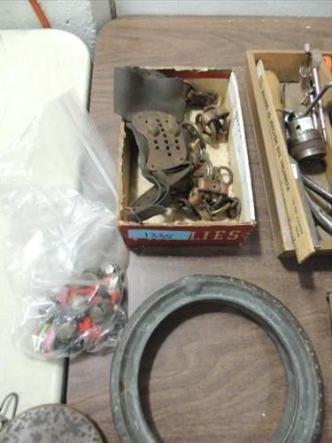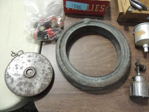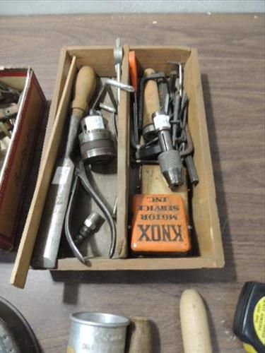 VINTAGE LOT ASSORTED TOOLS: DRILL CHUCKS, TAPE MEASURER, ALLEN WRENCHES, BRASS YARD WATER SPRINKLER AND MUCH MORE. AS SHOWN. VIEW PICTURE FOR DETAIL.