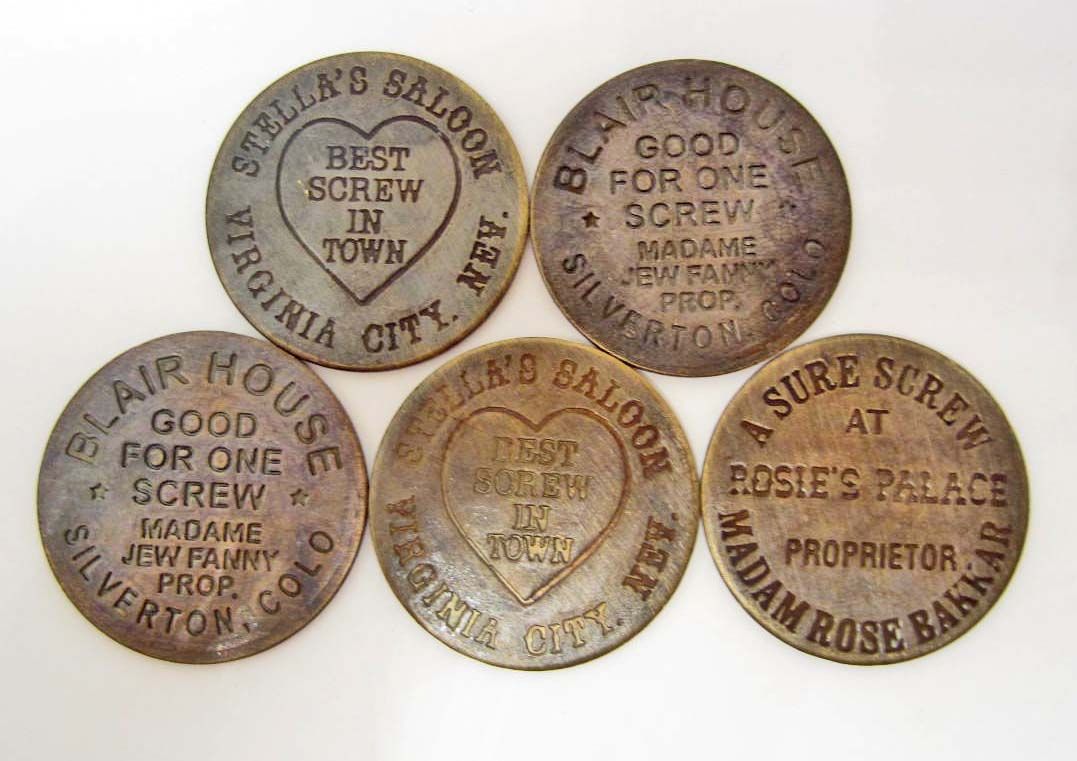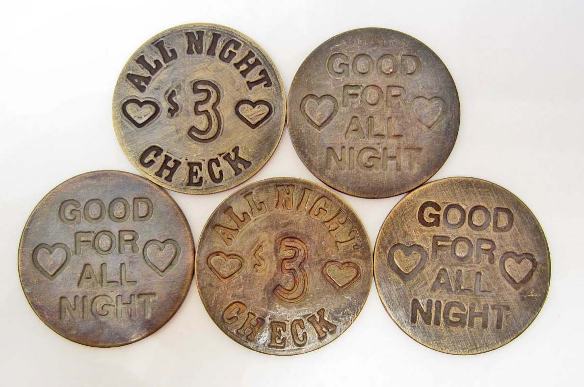 VINTAGE LOT OF 5 BRASS BROTHEL TOKENS