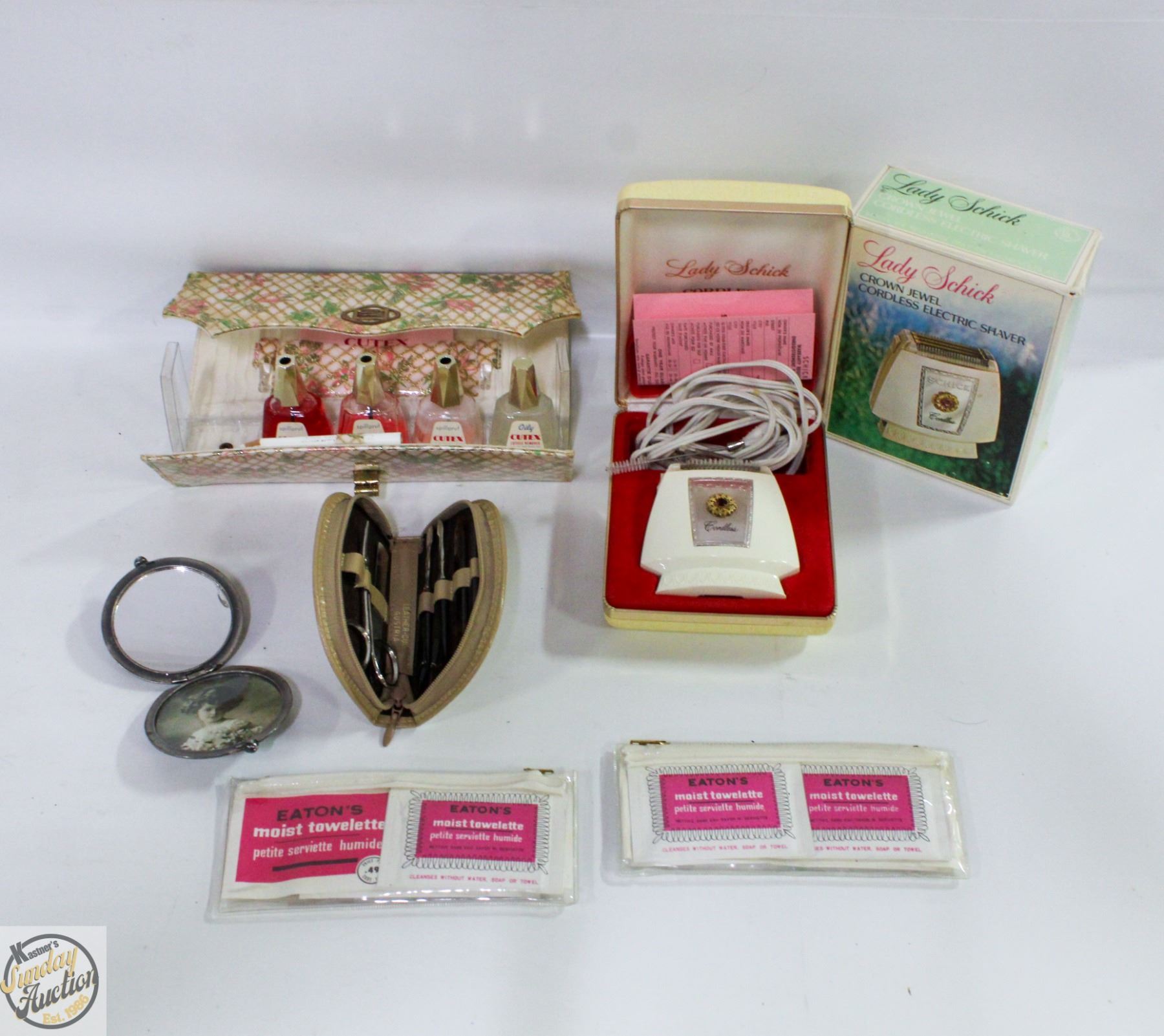 IN TRAVEL CASE 1 PC MISSING SOME UNUSED W/SHICK THE CROWN JEWEL RAZOR W/COMPACT MIRROR & EATONS MOIST TOWELTTE'S IN TRAVEL ZIP CASE (X2) **ALL ITEMS MUST BE REMOVED BY 5PM SATURDAY, NOVEMBER 1ST 2025. ALL REMAINING ITEMS WILL BE SUBJECT TO A $6.00 PER DAY STORAGE CHARGE. ANY ITEMS REMAINING AFTER MONDAY, NOVEMBER 17TH 2025 WILL BE CONSIDERED FORFEITED. NO REFUNDS WILL BE ISSUED FOR FORFEITED ITEMS. TO SCHEDULE A PICK UP APPOINTMENT CLICK HERE
