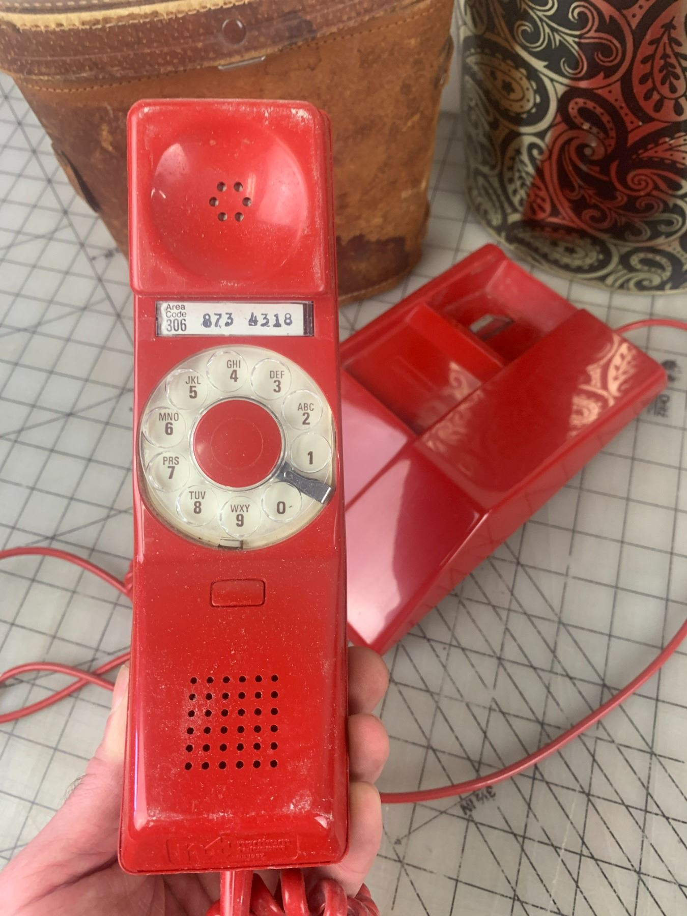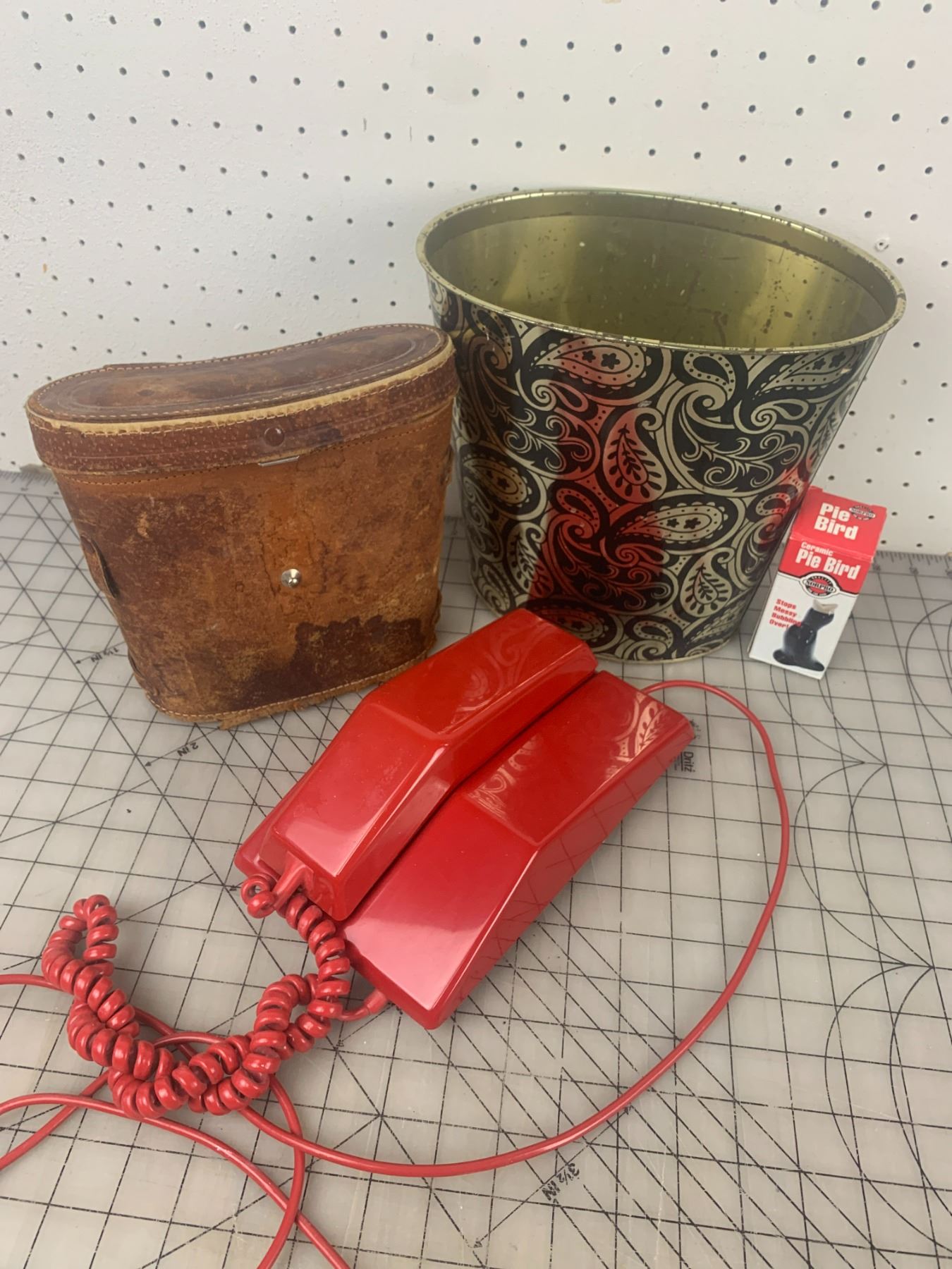 VINTAGE LOT RED DIAL PHONE WASTE BASKET PIE BIRD BINOCULARS