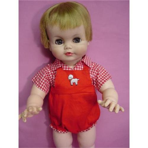 Vintage MA ALEX TIMMY TODDLER, 21", CHARMING! All vinyl jointed body, this very cute toddler will steal your heart! He has rooted short hair uncut and big brown sleep eyes with eyelashes. He is in good condition but has some chew marks on feet, not visible with shoes on. He has been redressed in a red jumpsuit and matching shirt.