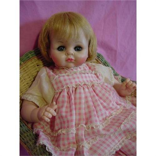 Vintage Mad Alex Pussycat, All Original. Beautiful Pussycat with big blue eyes, rosy complexion and smiling lips. She has vinyl limbs and cloth weighted body. She has rooted blonde hair. She is dressed in a pink gingham 2 pc dress with knitted booties. She is in very good condition . (Item #80000107)