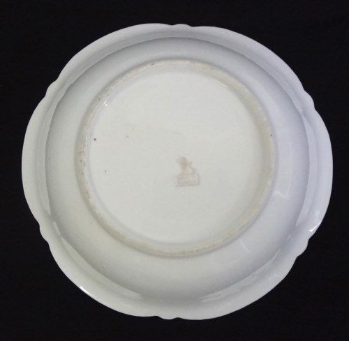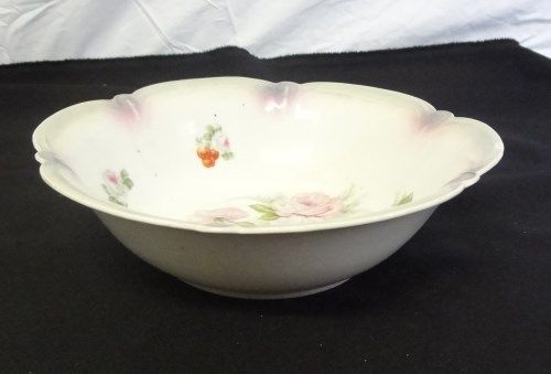 A 10" BOWL WITH A GORGEOUS FLOWER AND CHERRY DESIGN IN THE BOTTOM OF THE BOWL. THE MARKING ON THE BOTTOM OF THE BOWL IS A LION ON A PEDESTAL THAT SAYS MADE IN BAVARIA.