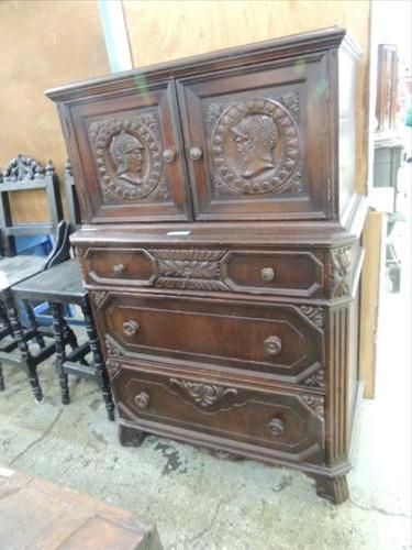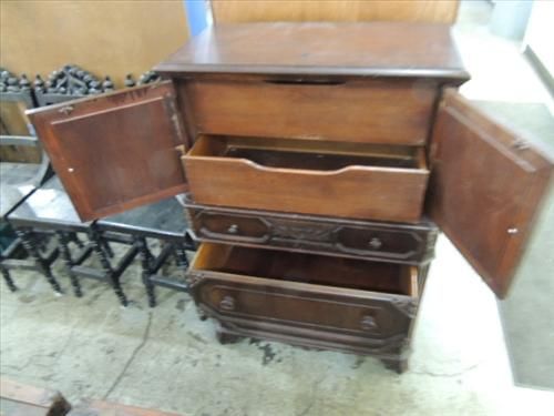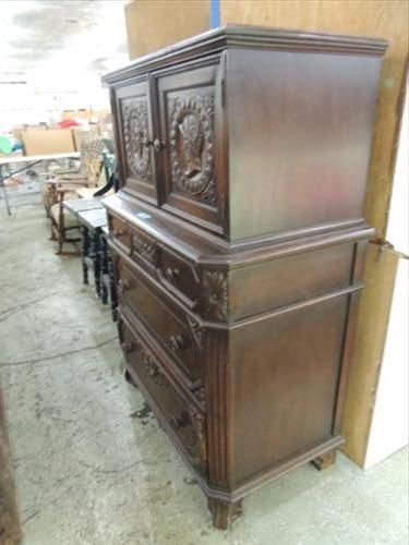 VINTAGE MAHOGANY 5 DRAWER HIGH BOY DRESSER WITH CARVED DOORS. TENNESSEE FURNITURE COMPANY. 36X20X53. AS SHOWN. VIEW PICTURE FOR DETAIL.