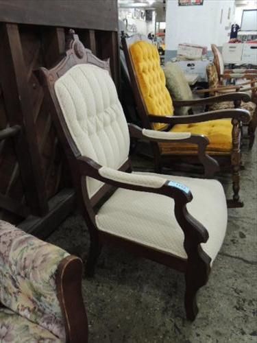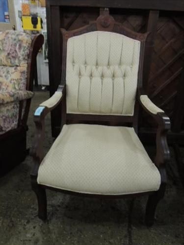 VINTAGE MAHOGANY EMPIRE STYLE PARLOR CHAIR, METAL CASTORS. RE-UHPOLSTERED. AS SHOWN. VIEW PICTURE FOR DETAIL.