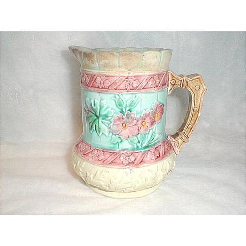 THIS SALE IS FOR A BEAUTIFUL VINTAGE MAJOLICA PITCHER THAT IS IN VERY GOOD CONDITION. THIS PITCHER MEASURES 5 1/2 IN. TALL AND 6 IN. WIDE FROM SPOUT TO HANDLE AND HAS LOVELY COLORS OF AQUA WITH PINK FLOWERS AND A PINK BORDER WITH A LIGHT BROWN HANDLE. THE INSIDE OF THE VASE IS AN AQUA SHADE...