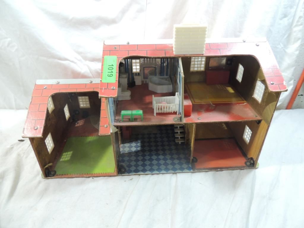 VINTAGE DOLLHOUSE, COMPOSITION, PRESSED WOOD DOLLHOUSE, LITOGRAPH DOLLHOUSE, VINTAGE DOLLHOUSE, BUILT IN FURINTURE IN SOME ROOMS, AS SHOWN SEE PHOTO FOR MORE DETAILS.