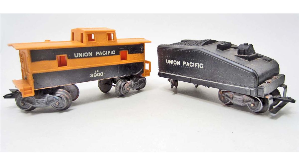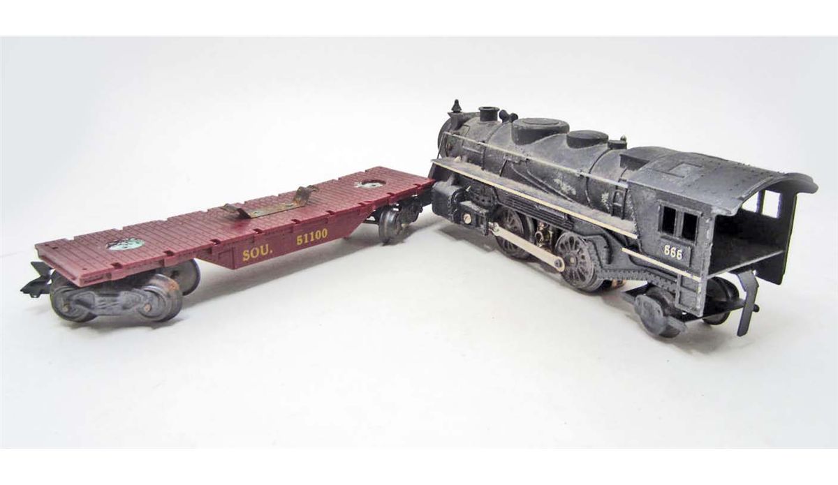 Marx 666 smoking locomotive, Tender, Flat Car and Caboose.
