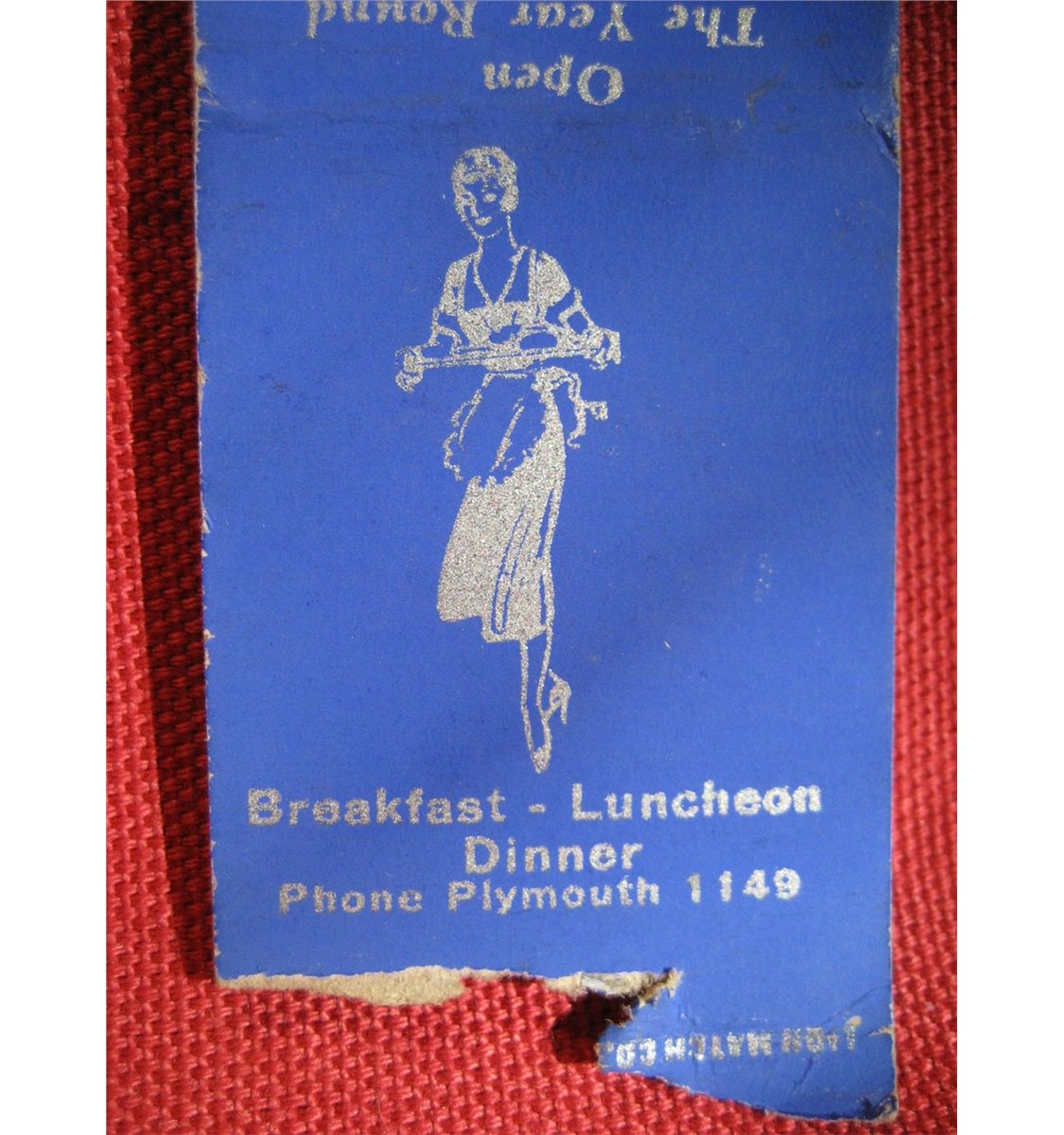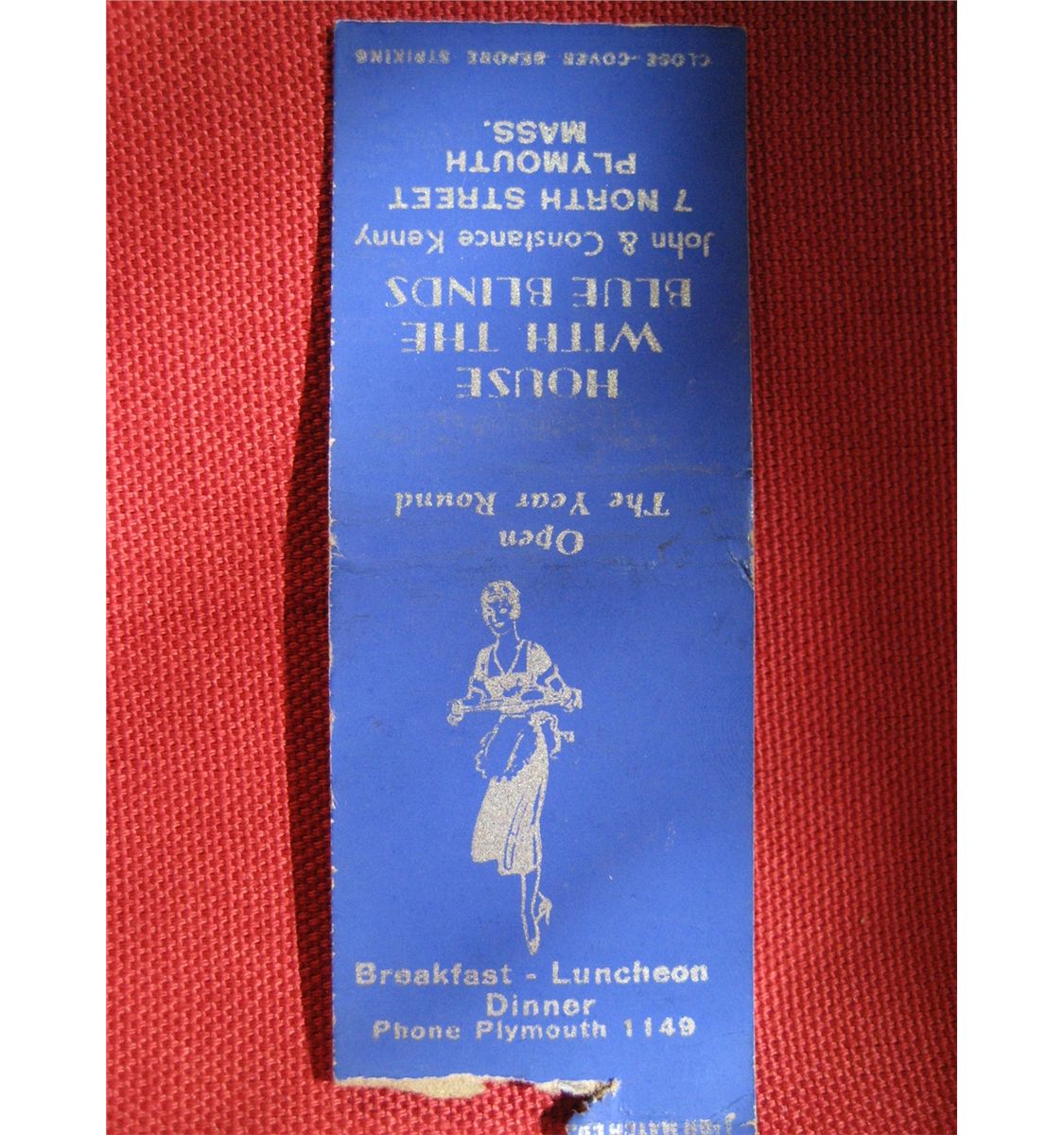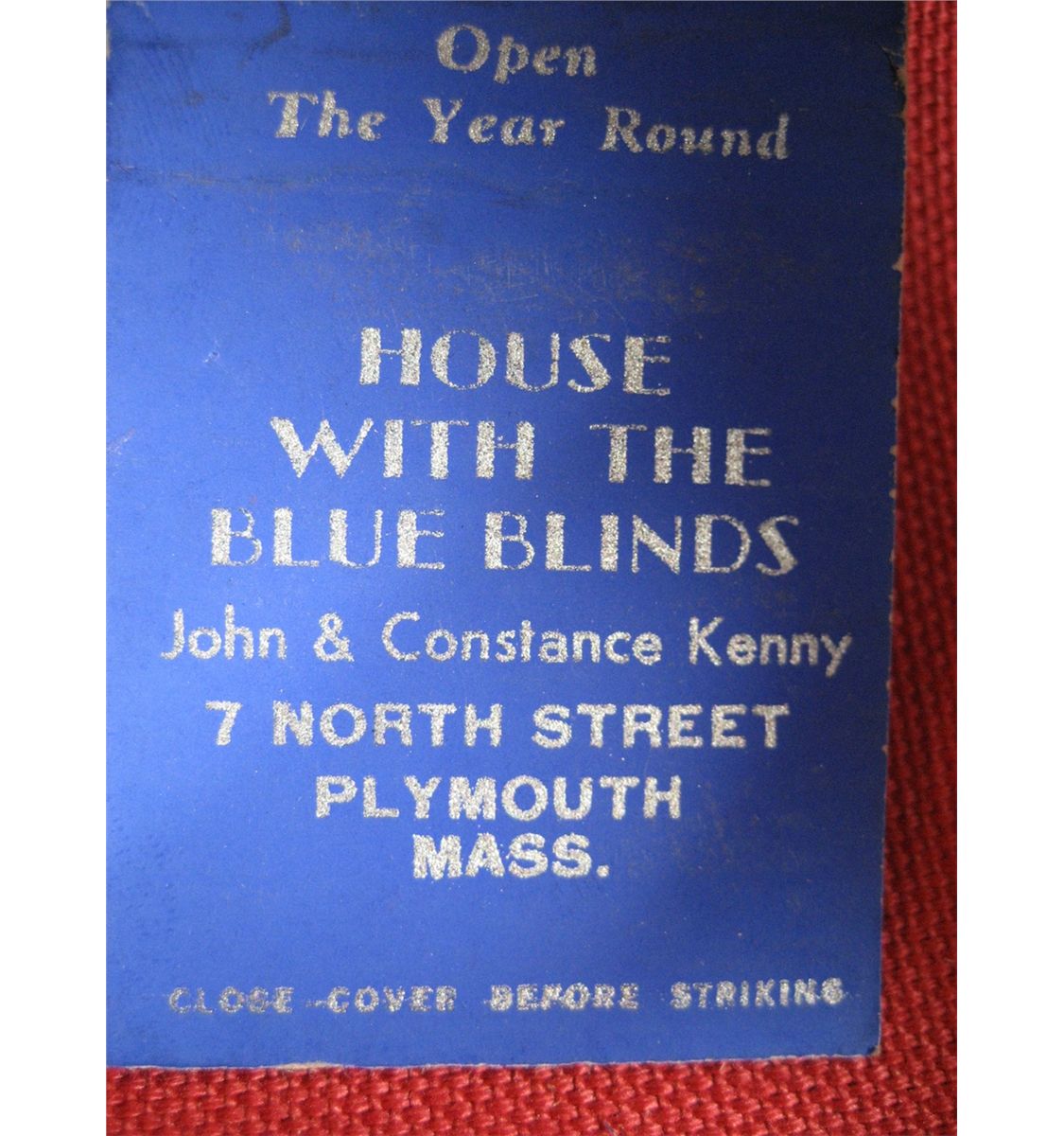 VINTAGE MATCHBOOK COVER HOUSE WITH THE BLUE BLINDS JOHN & CONSTANCE KENNY PLYMOUTH MASS.