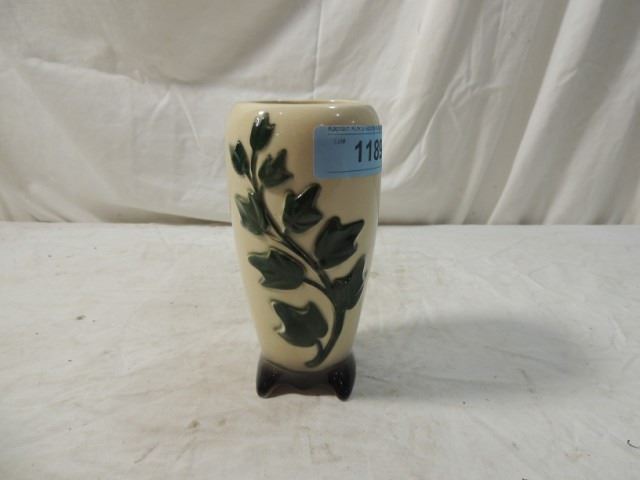 7" TALL POTTERY VASE, UNMARKED, AS SHOWN.