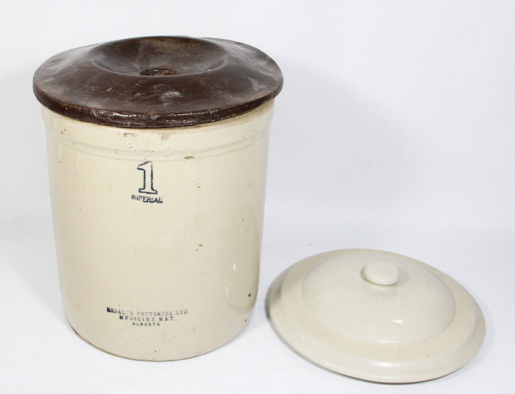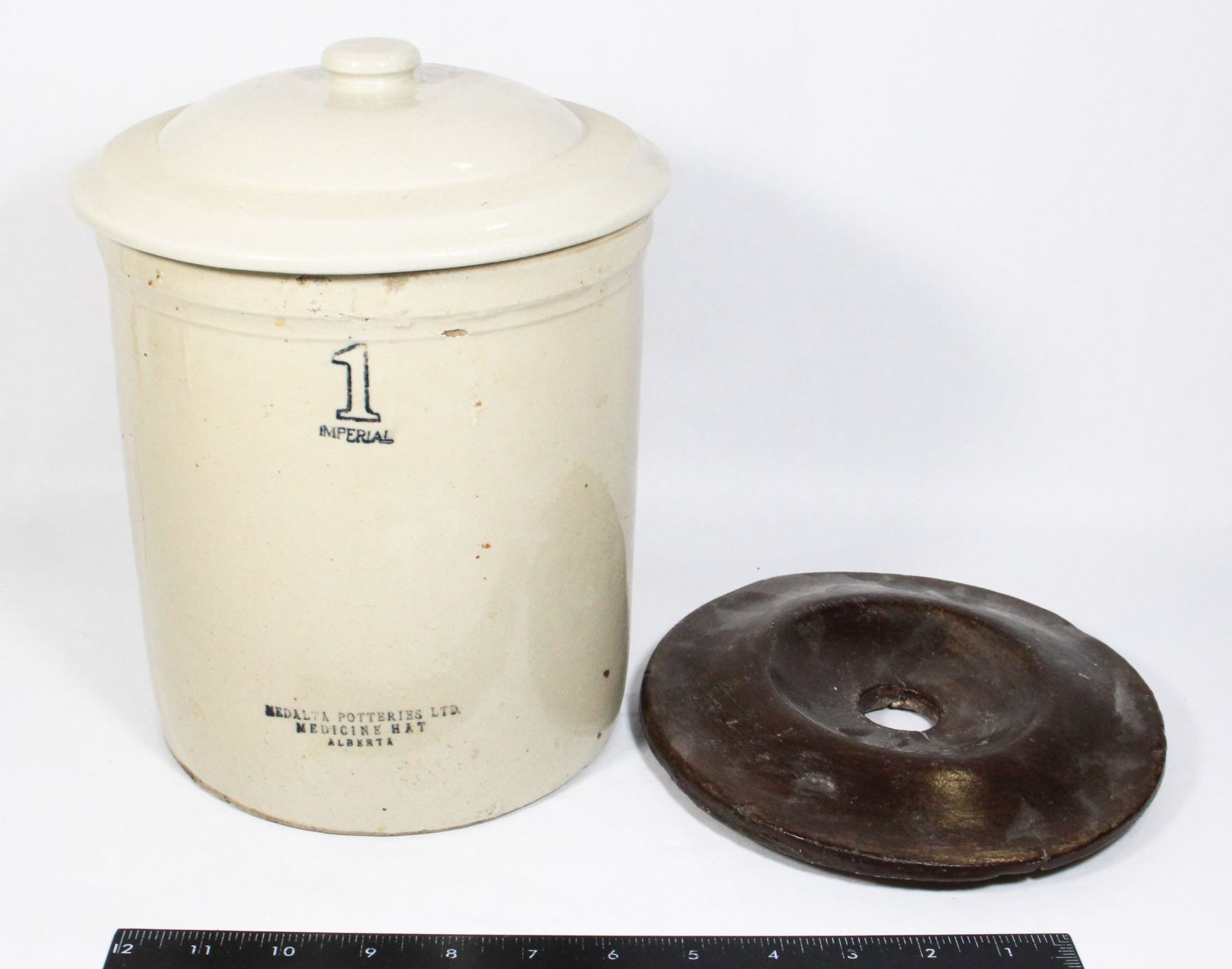 VINTAGE STONEWARE CROCK FROM MEDALTA POTTERIES MEDICINE HAT ALBERTA.1-IMPERIAL GALLON.