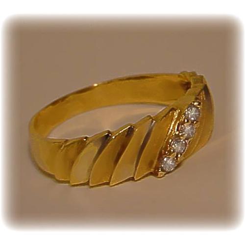 VINTAGE MEN'S RING HAS DISTINCTIVE FISH SCALE EFFECT AND GENUINE DIAMONDS IN THE CENTER. SOLID 14 KARAT YELLOW GOLD. <p> <P> This is a vintage item in pristine condition. <p> Please note: our merchandise is guaranteed 100% to your satisfaction. If you DON'T LOVE this item, simply return it for a complete refund of your purchase price. Our feedback is 100% positive, so you can shop with confidence, knowing that your satisfaction is our primary concern. <p> * Insurance is included in our shipping charges.