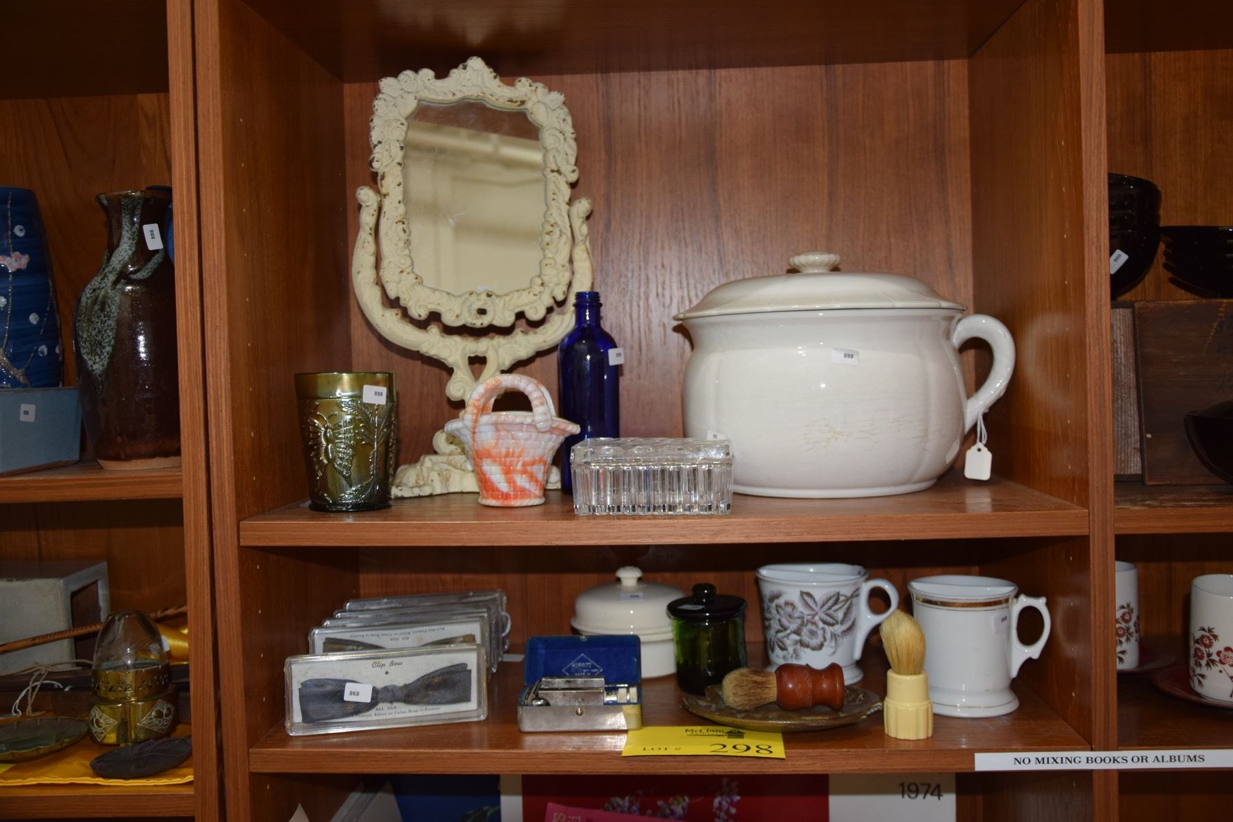 VINTAGE MEN'S SHAVING ACCESSORIES: SHAVING MUGS & BRUSHES, MIRROR, RAZOR, BOW TIES, CHAMBER POT, ETC