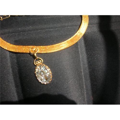 THIS VINTAGE GOLD MESH CHOKER HAS A GOLD AND  INTERESTING STONE ON THE PENDANT.  IT IS IN GOOD CONDITION.
