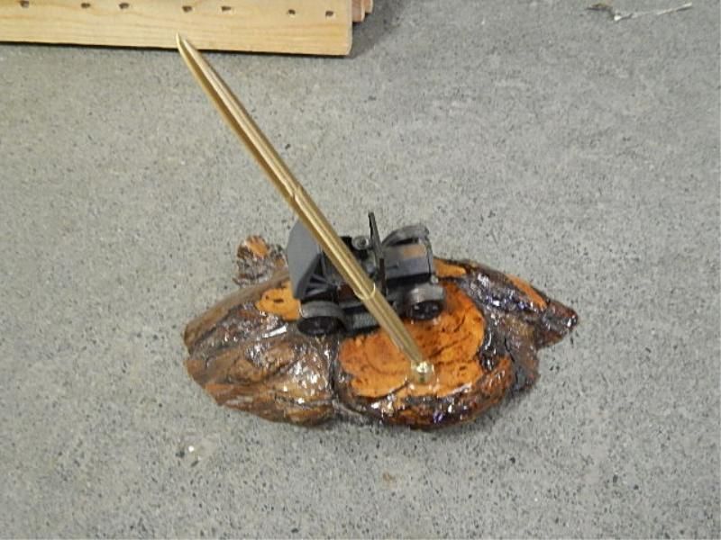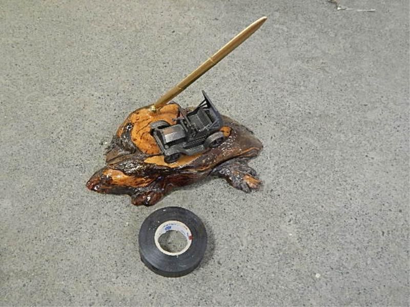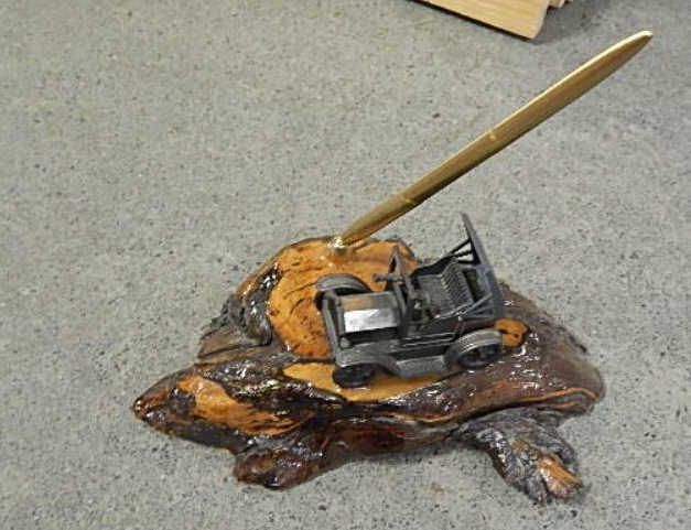 VINTAGE METAL CAR ON BURL STAND - PEN HOLDER