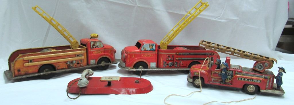 2- MAR FIRETRUCKS (1 BATTERY OPERATED) 1- PULL FIRETRUCK TOY, 1 ARMY MORSE CODE TOY EXACT SHIPPING
