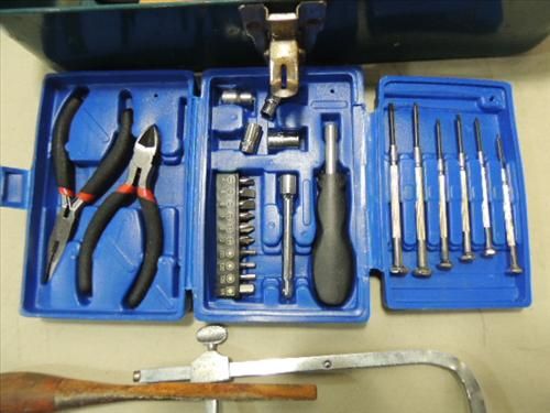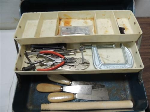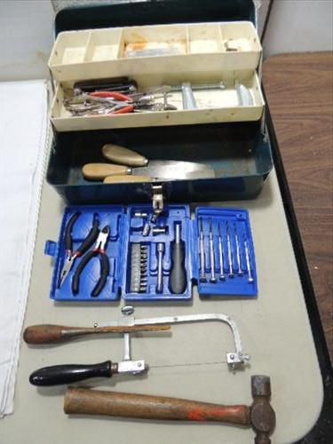 VINTAGE METAL TOOL BOX LOADED WITH JEWELER TOOLS & SMALL HAND TOOLS. AS SHOWN. VIEW PICTURE FOR DETAIL.