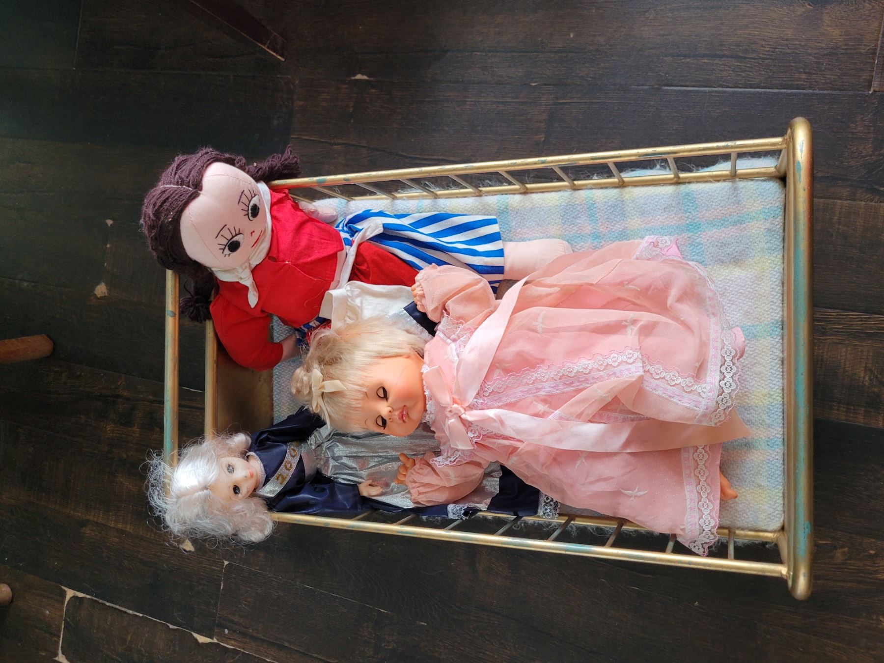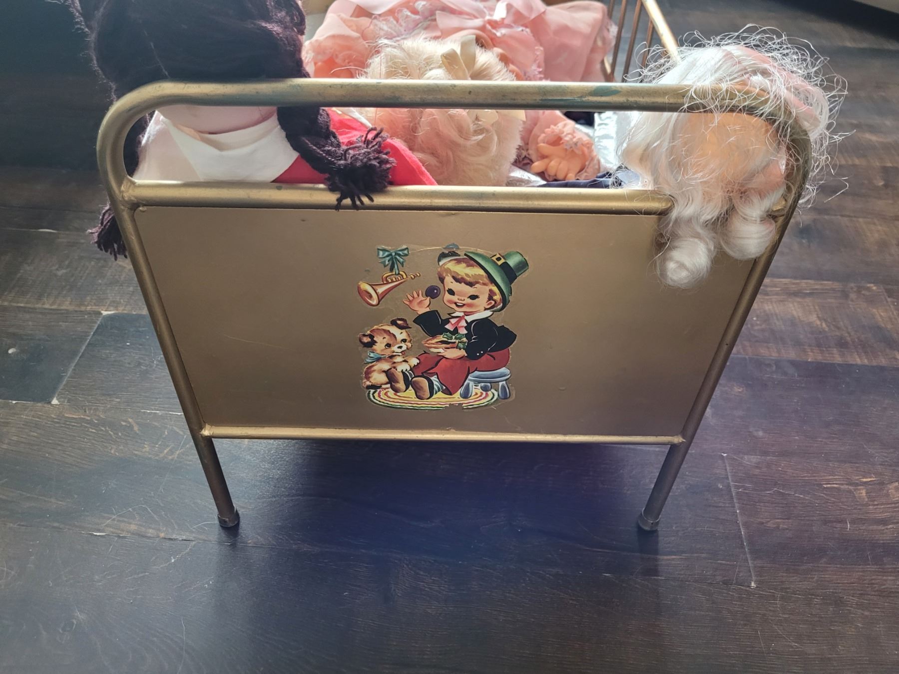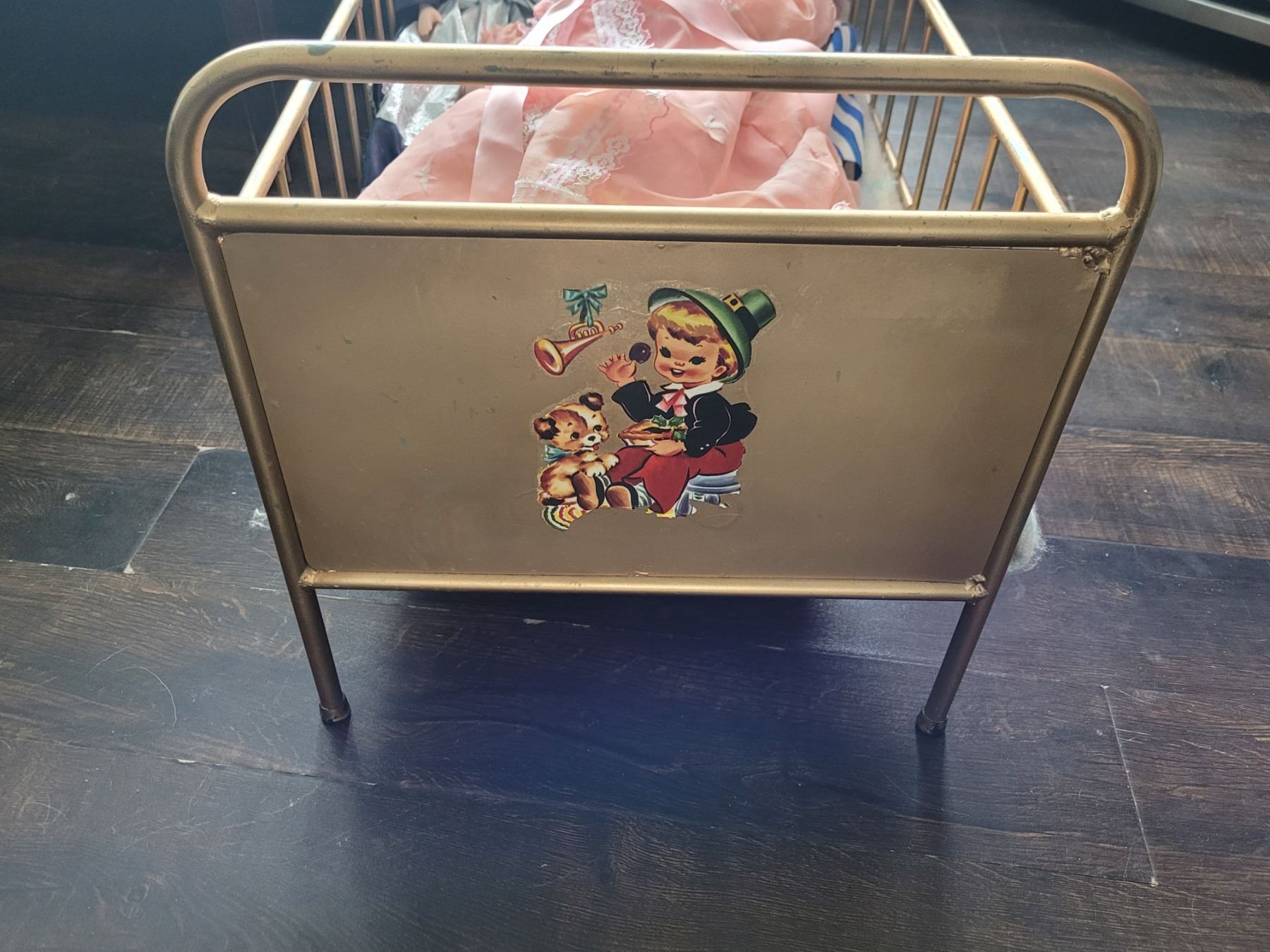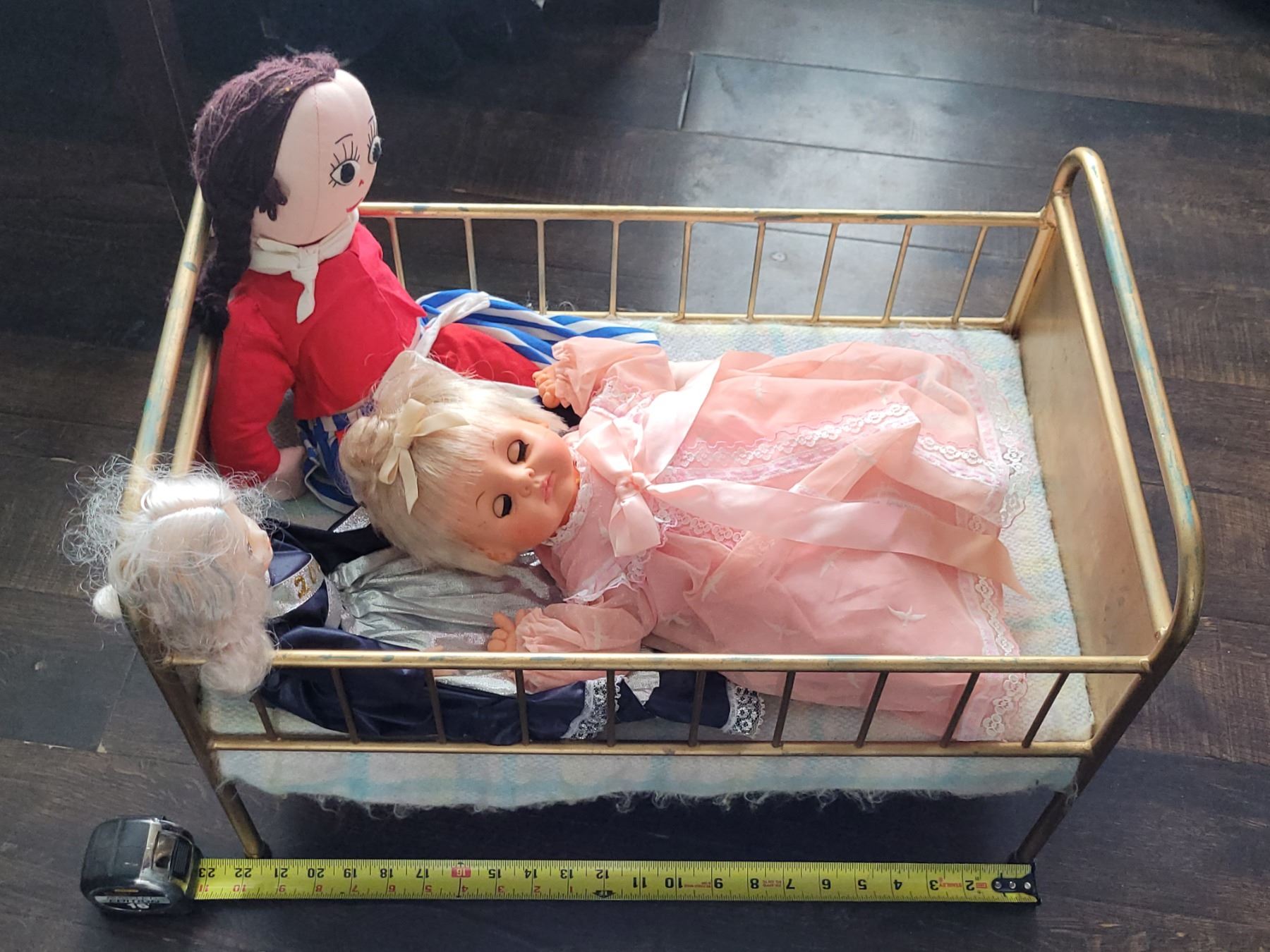 VINTAGE METAL TOY DOLL CRIB WITH 3 DOLLS. CAN BE SHIPPED. THIS CRIB HAS A BIT OF WEIGHT TO IT. VERY WELL MADE. SEE PICTURES AND JUDGE FOR YOURSELF!