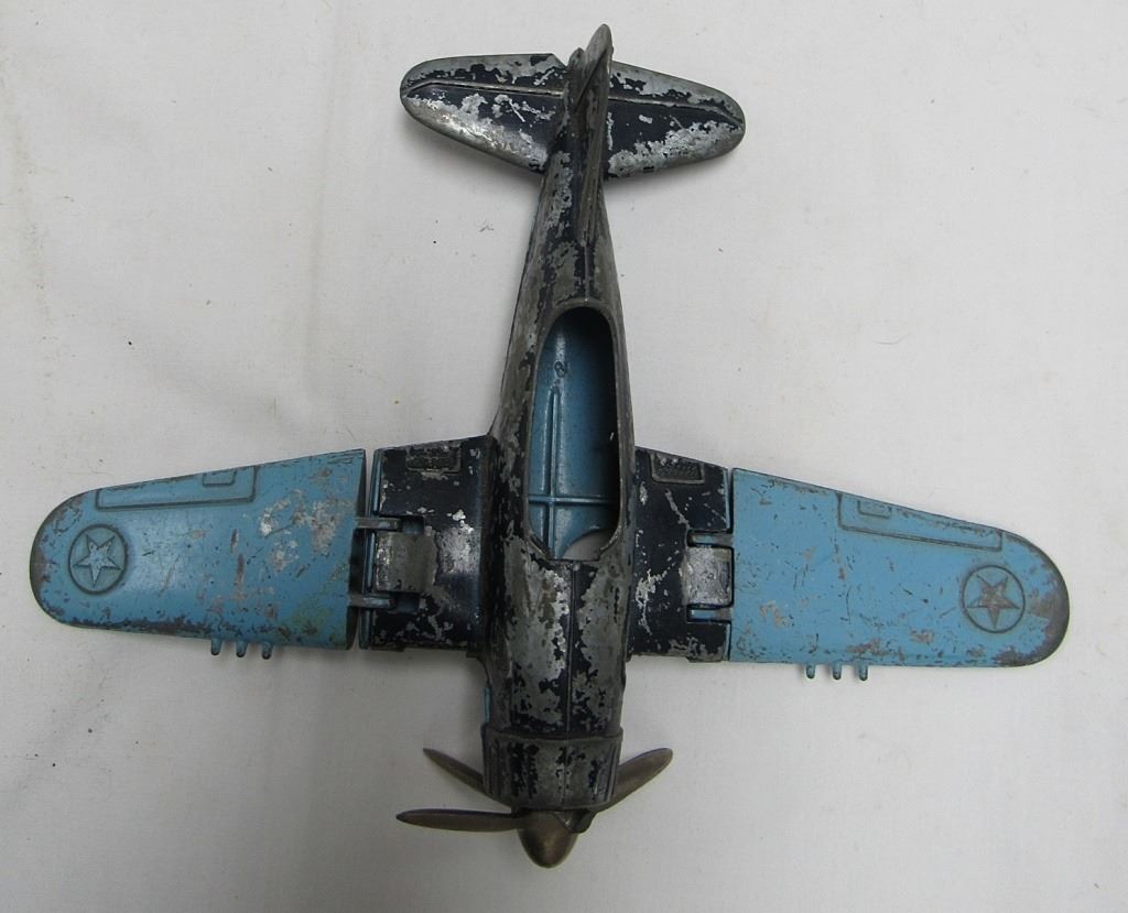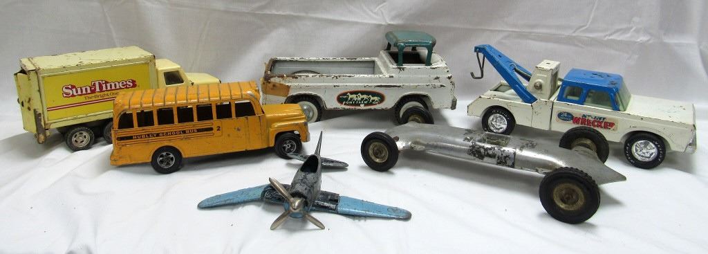 NYLINT 24 HOUR SERVICE WRECKER, ERTL SUN-TIMES THE BRIGHT ONE TRUCK, HUBLET SCHOOL BUS, HUBLEY KIDDIE TOY METAL PLANE, NYLINT PONY FARM TRUCK, THIMBLE DROME METAL RACE CAR