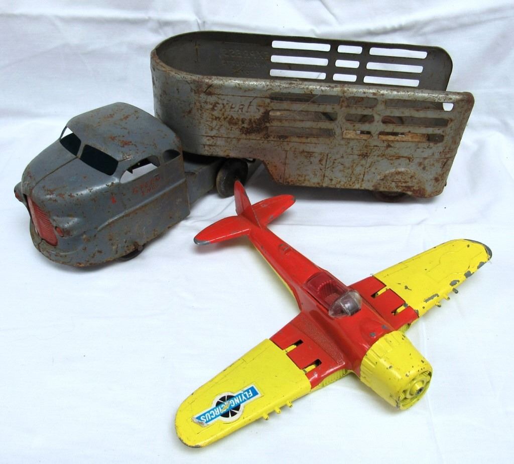 WYANDOTTE TRUCK AND TRAILER, HUBLEY KIDDIE TOY AIRPLANE "FLYING CIRCUS" NO. 495 EXACT SHIPPING