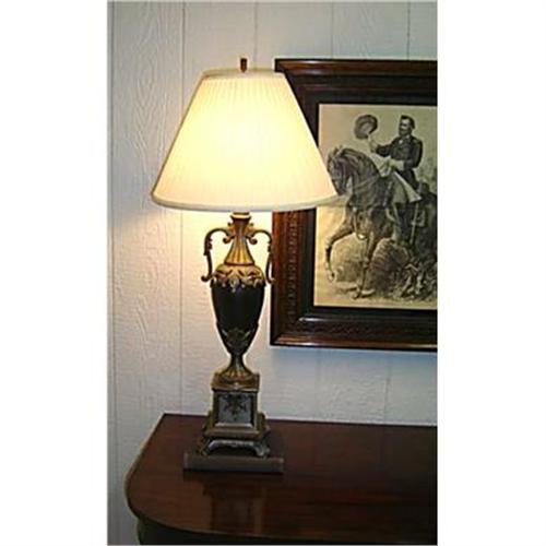 A CLASSIC SHAPE ON AN OLD LAMP BASE WHICH HAS BEEN RECENTLY REWIRED. IT IS MADE OF HEAVY METAL WITH AN ONXY LIKE VASE RICHLY ENCASED WITH DECORATIVE METAL MOLDINGS. IT WILL BE SHIPPED WITHOUT THE SHADE, SINCE IT COSTS MORE FOR SHIPPING THAN TO BUY A NEW SHADE. THE LAMP BASE HAS A LITTLE CORROSION, JUST ENOUGH TO MAKE IT INTERESTING, BUT NOT DISTRACTING. VERY NICE. IT IS PHOTOGRAPHED SITTING ON A BOOK.