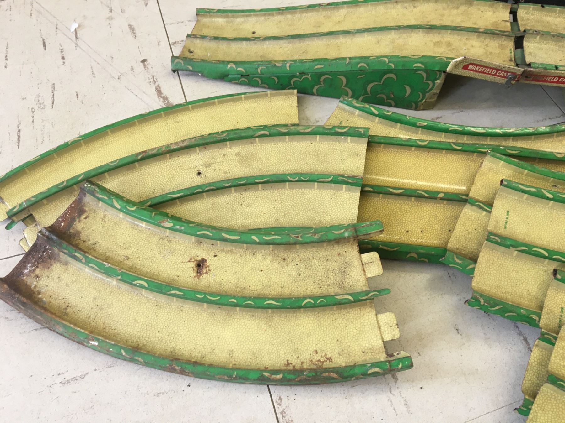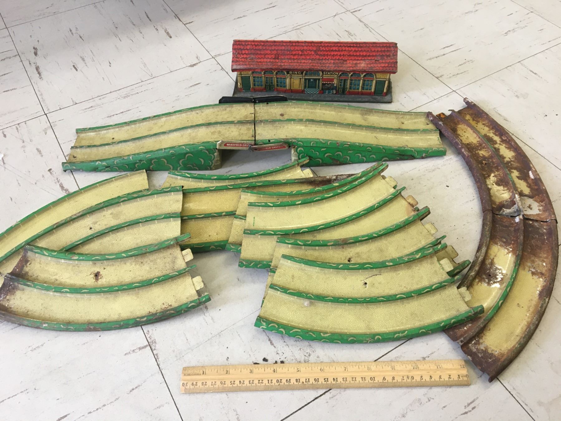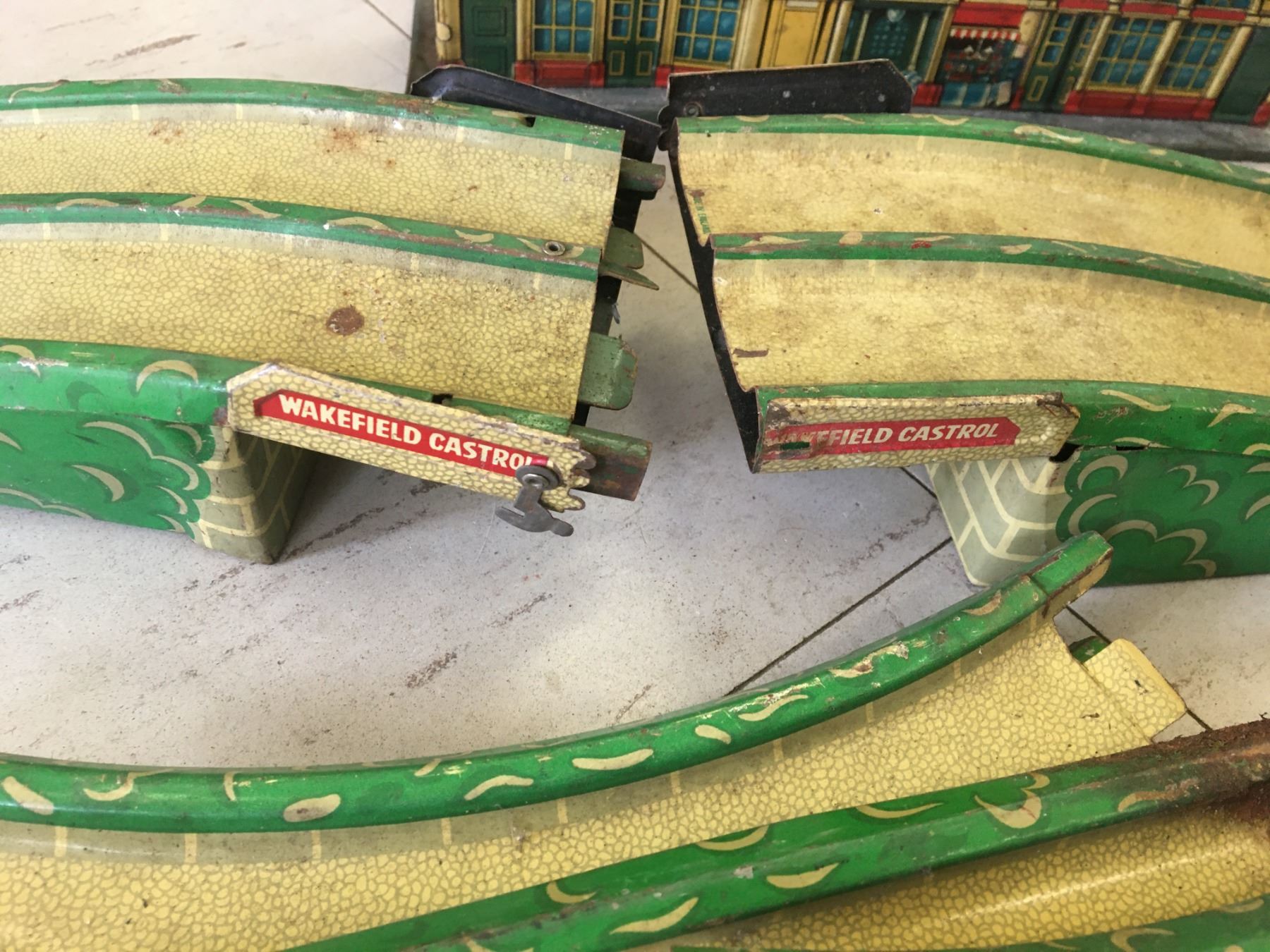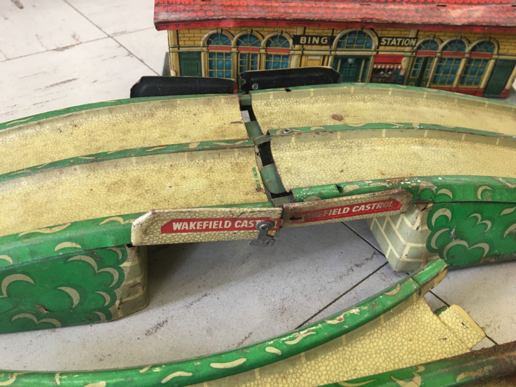 VINTAGE METAL WAKEFIELD CASTROL TOY CAR TRACK (GERMANY) AND TRAIN STATION (ENGLAND)