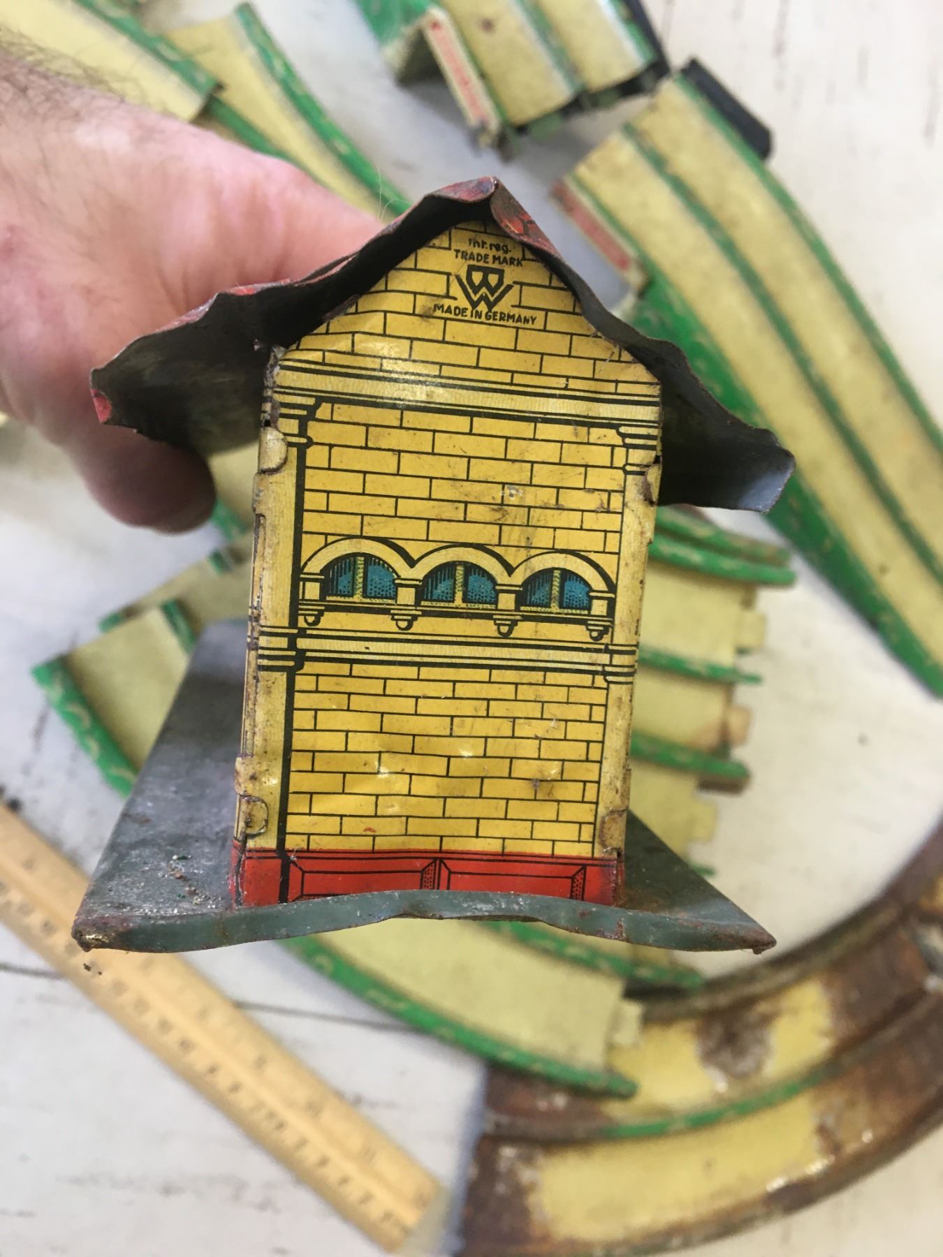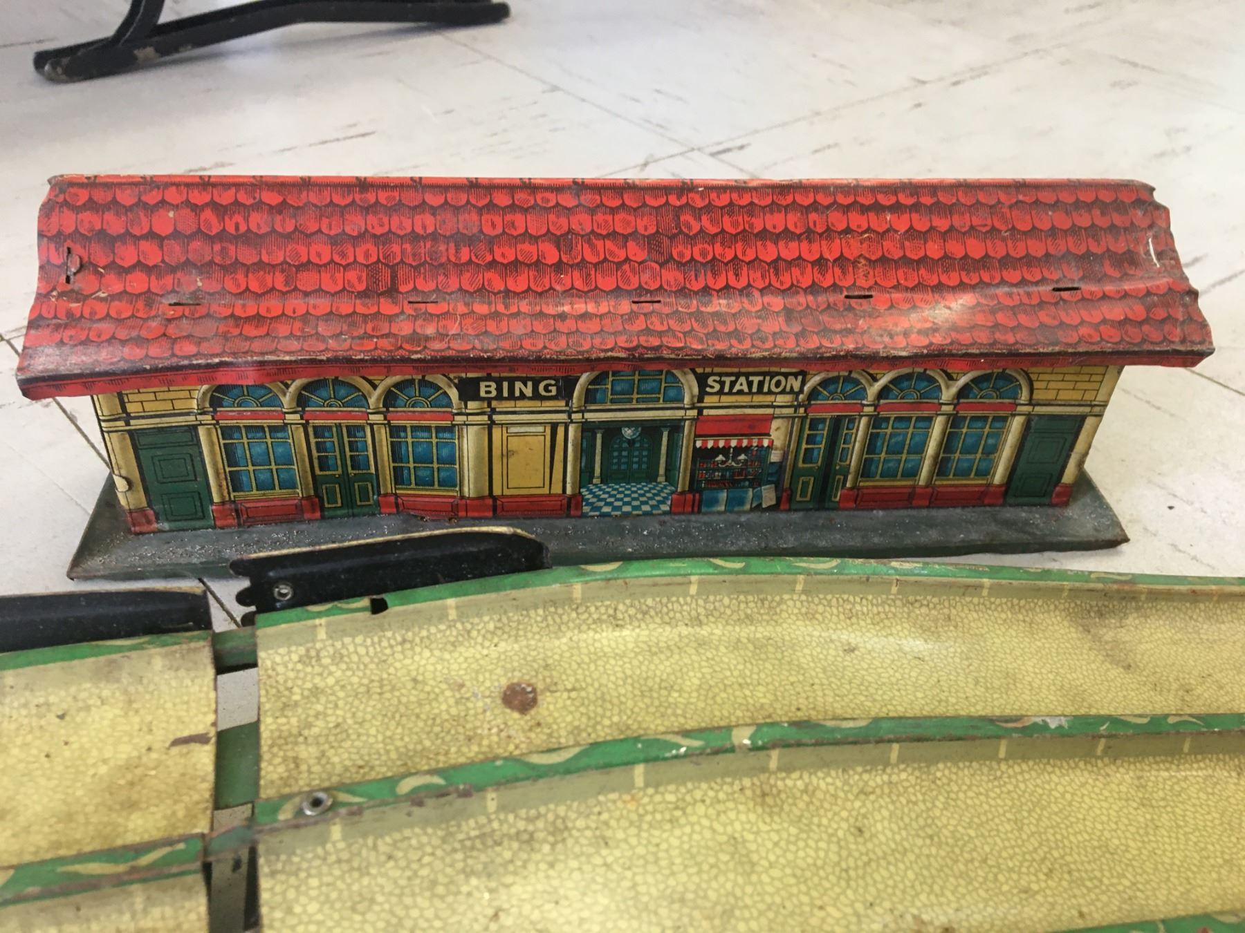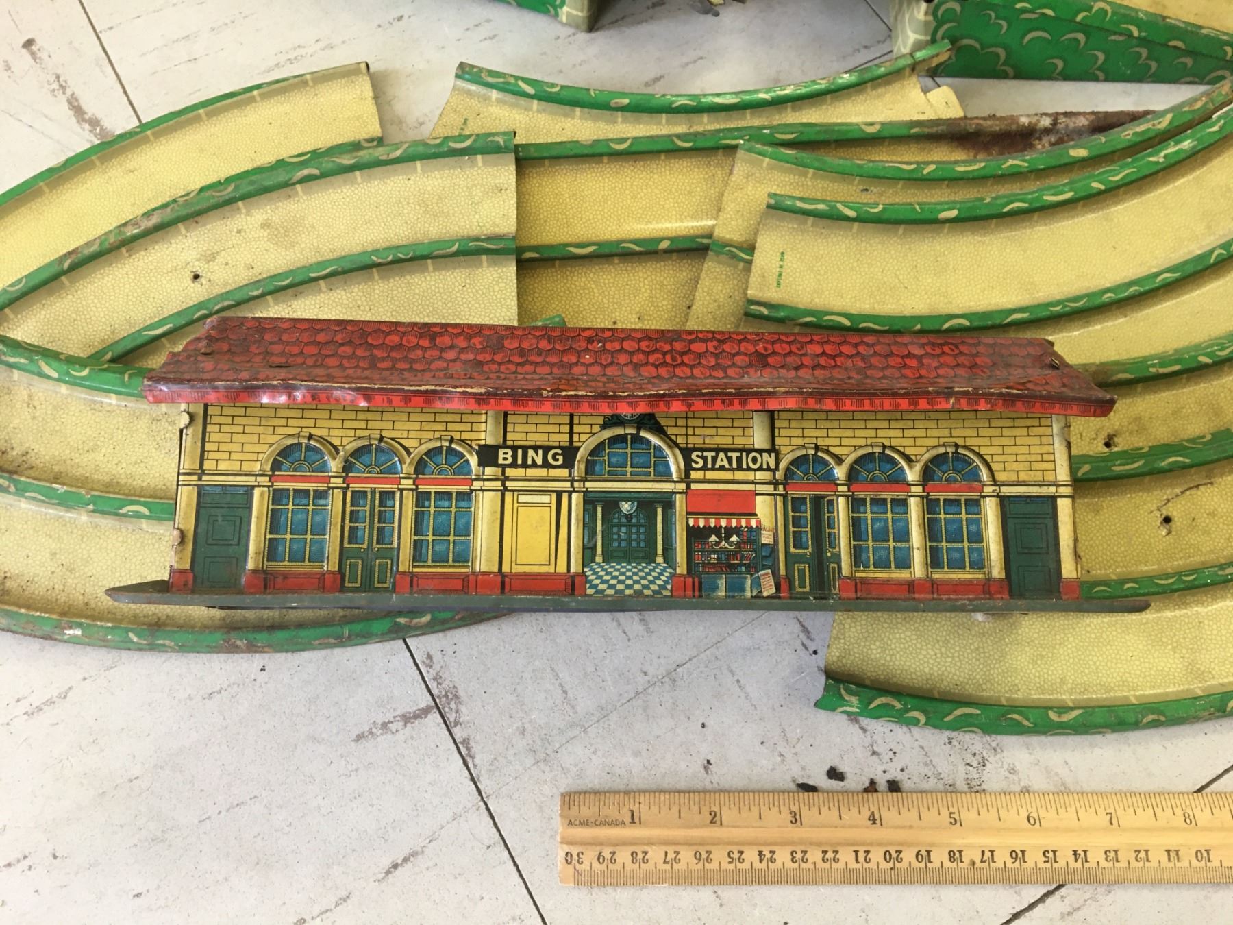 VINTAGE METAL WAKEFIELD CASTROL TOY CAR TRACK (GERMANY) AND TRAIN STATION (ENGLAND)