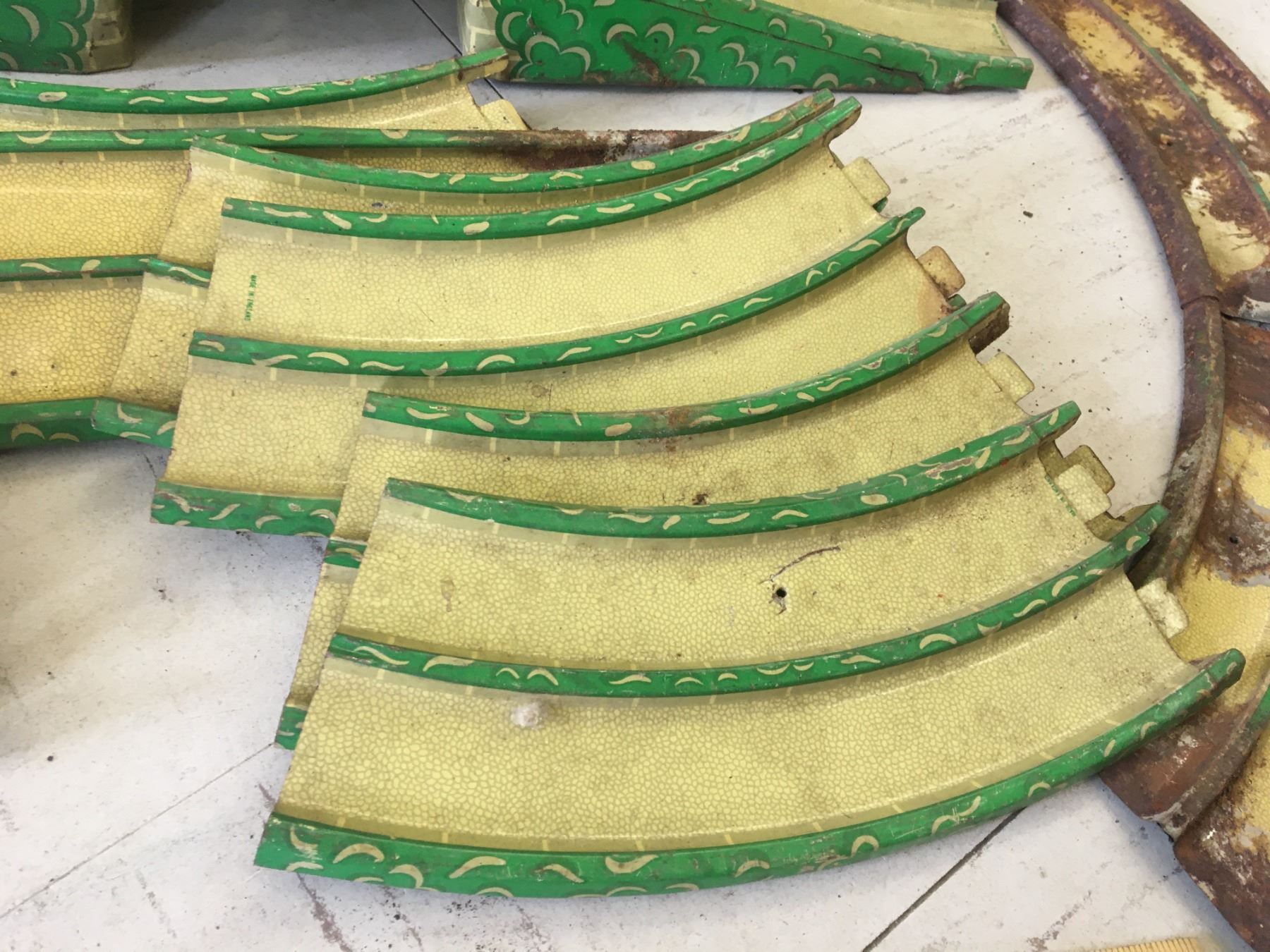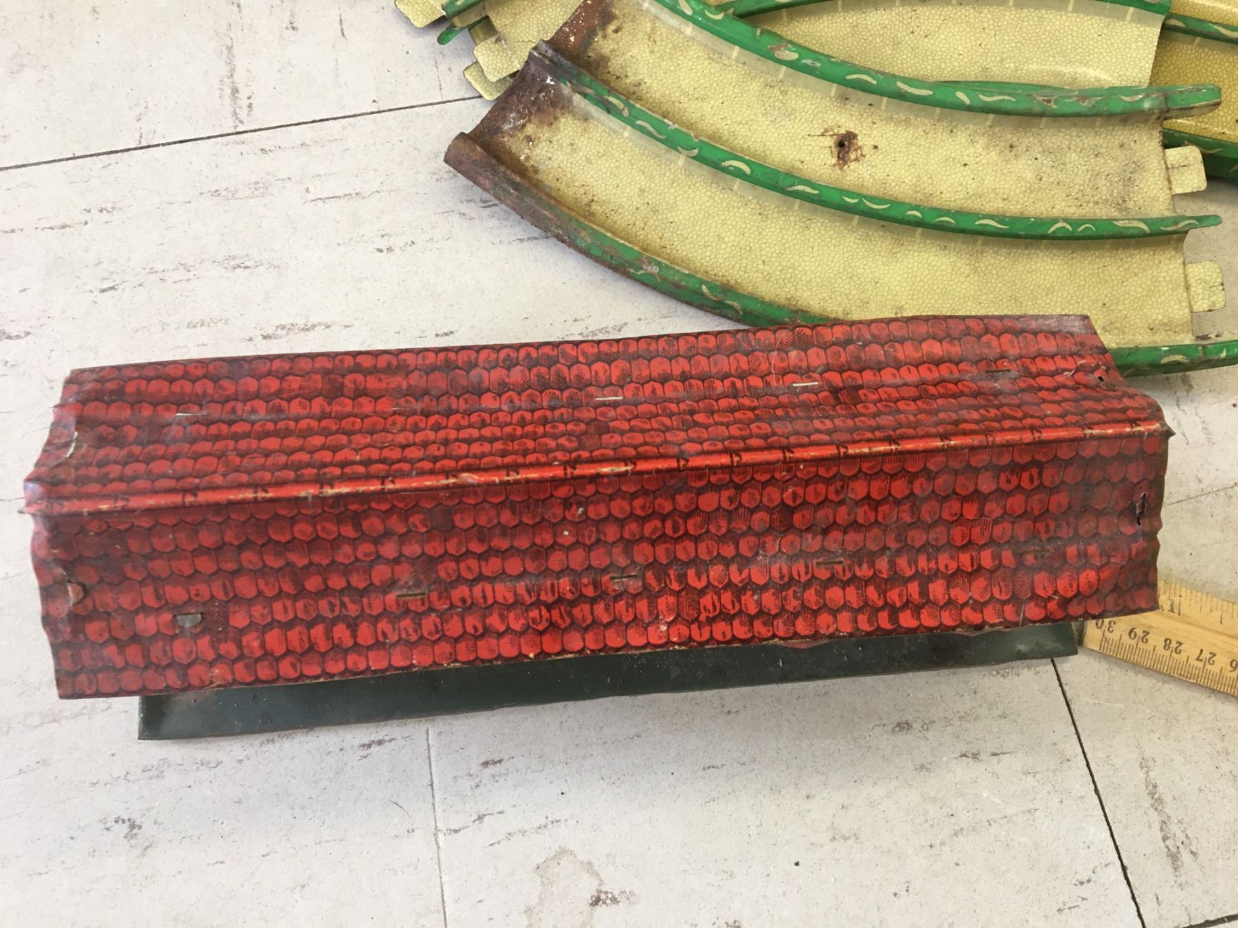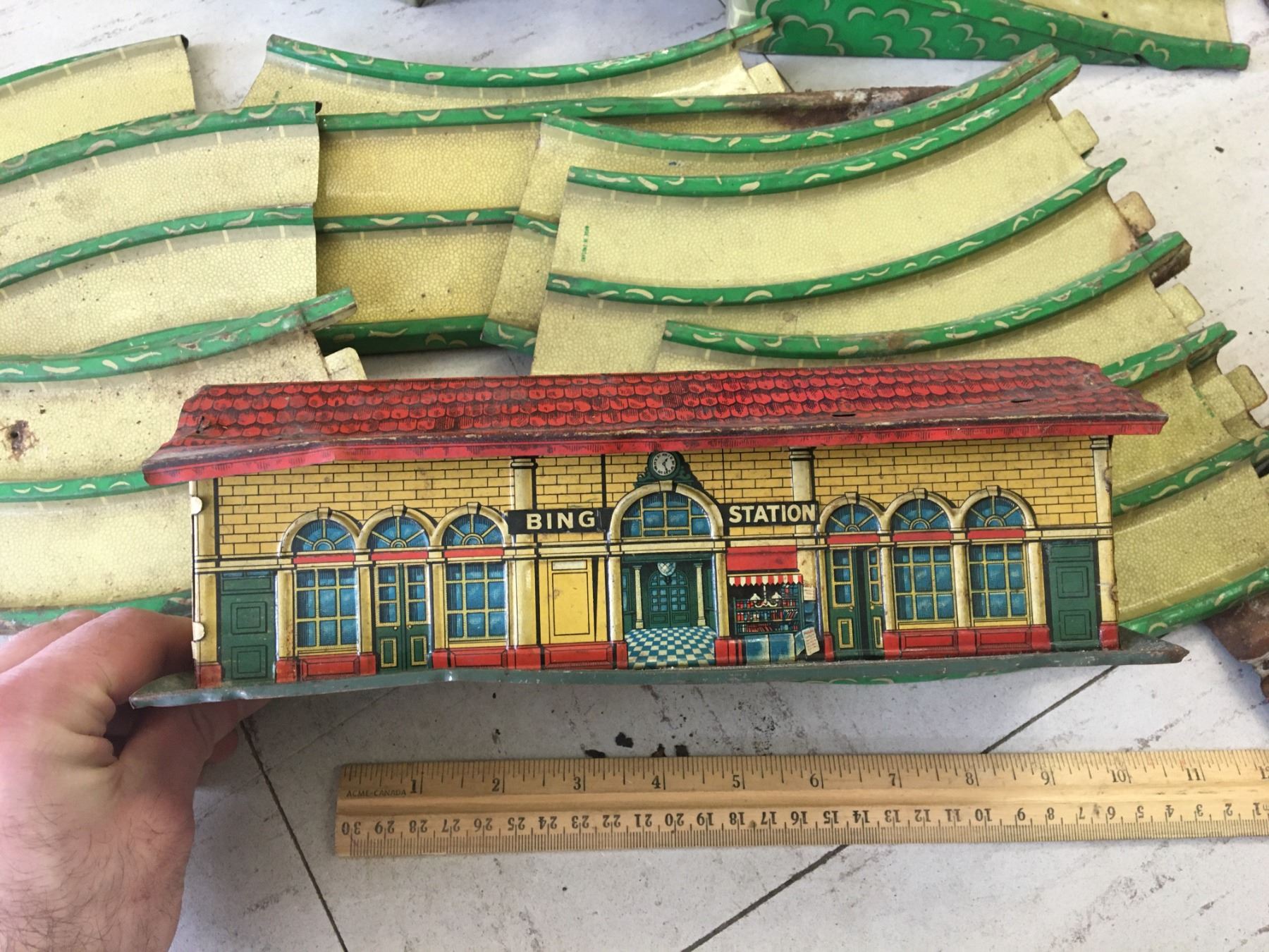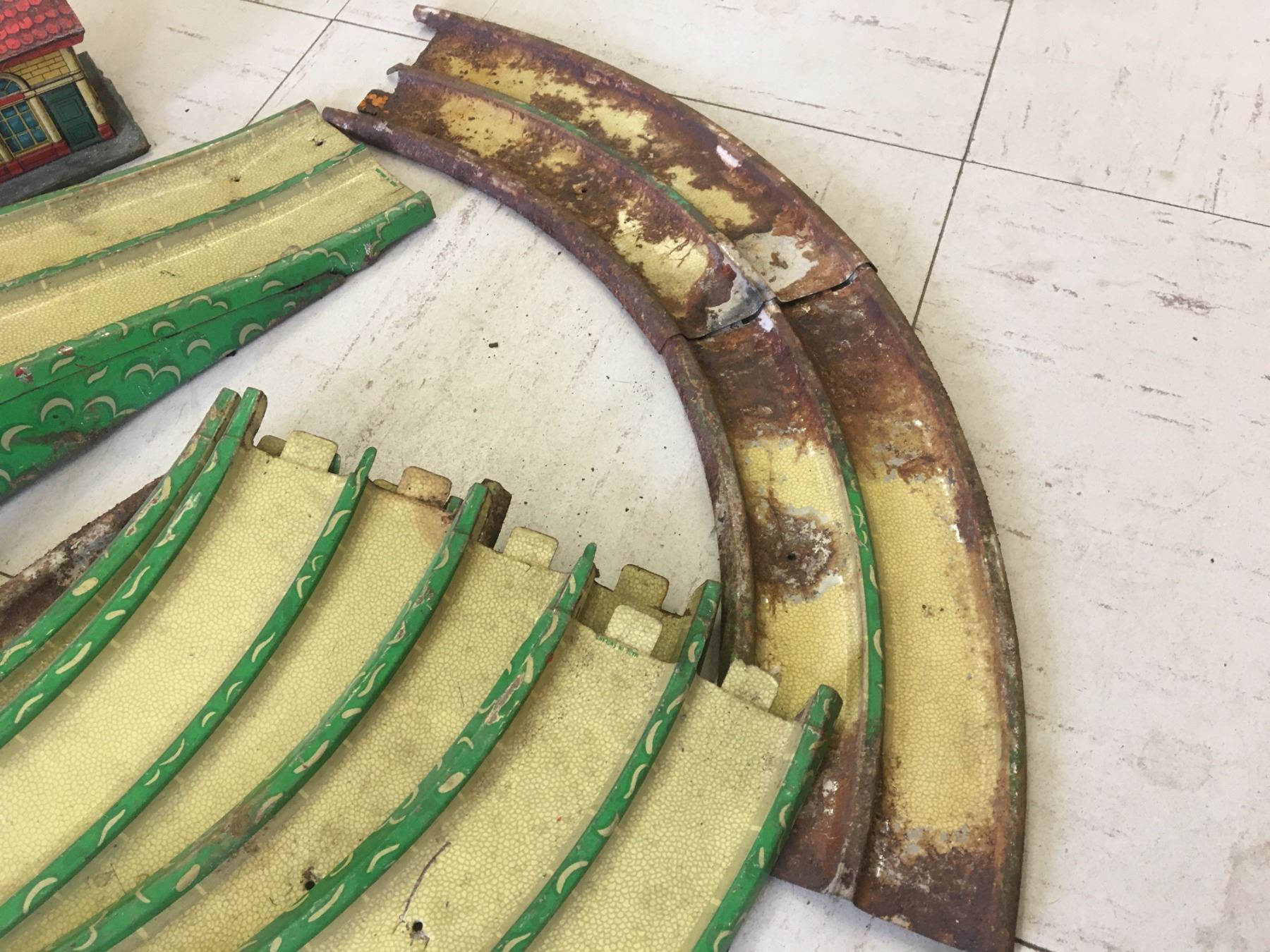 VINTAGE METAL WAKEFIELD CASTROL TOY CAR TRACK (GERMANY) AND TRAIN STATION (ENGLAND)