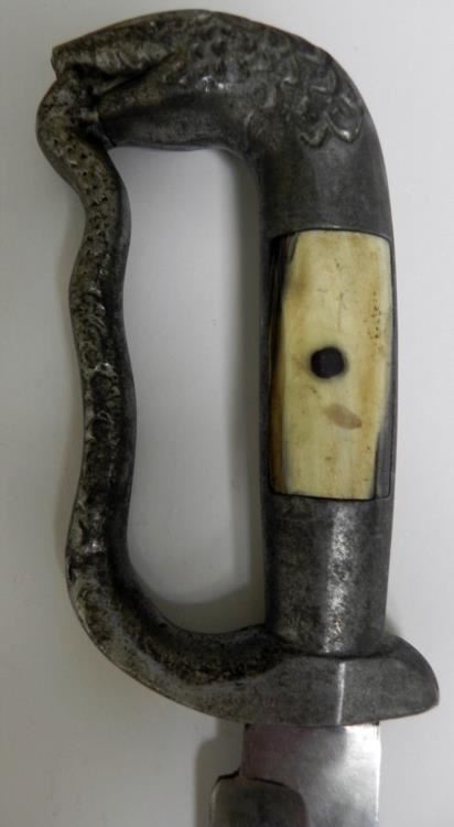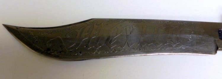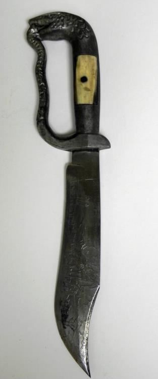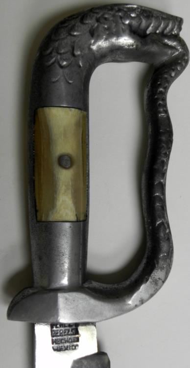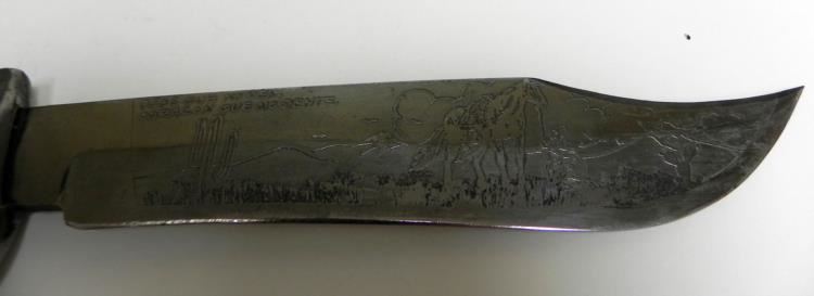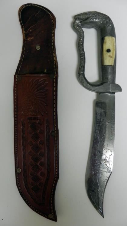 OFFERED HERE IS AN OUTSTANDING VINTAGE MEXICAN BOWIE KNIFE-DOUBLE ETCHED WITH LEATHER SCABBARD. THIS SUPERB ARTISTRY AND WORKMANSHIP ON THIS KNIFE--POMMEL AND HAND-GUARD IS OF A COBRA AND IT'S TAIL--CENTER GRIP IS A BUFFED HORN--8" BOWIE KNIFE IS A BEAUTY--ON ONE SIDE THE ETCHING IS OF A MEXICAN MOUNTAIN SCENE WITH CACTUS, CENTRAL TO WHICH IS A HORSE WITH A RIDER SITTING ON THE GROUND--TOP LEFT READS "OJOS QUE NO VEN, CORAZON QUE NO SIENTE"--REVERSE "MEXICO"--RICASSO "PEREZ-HECHO IN MEXICO"--SHEATH IS A BEAUTY IN BROWN LEATHER--HAS BACK BELT LOOP--FRONT STAMPED WITH AN AMERICAN-INDIAN-MEXICO AND FANCY TOOL WORK.