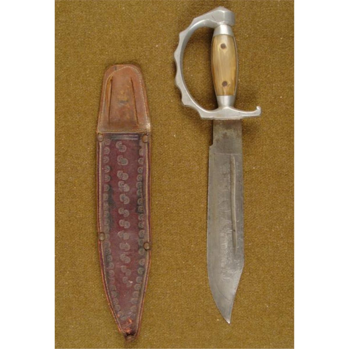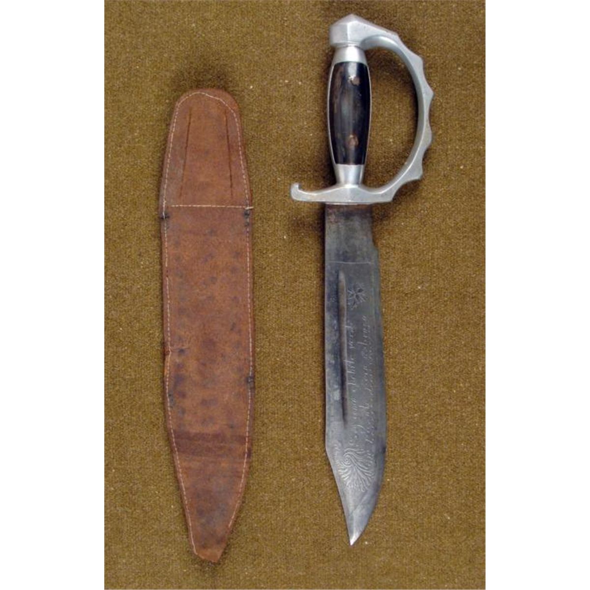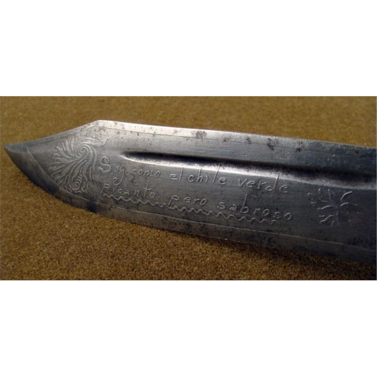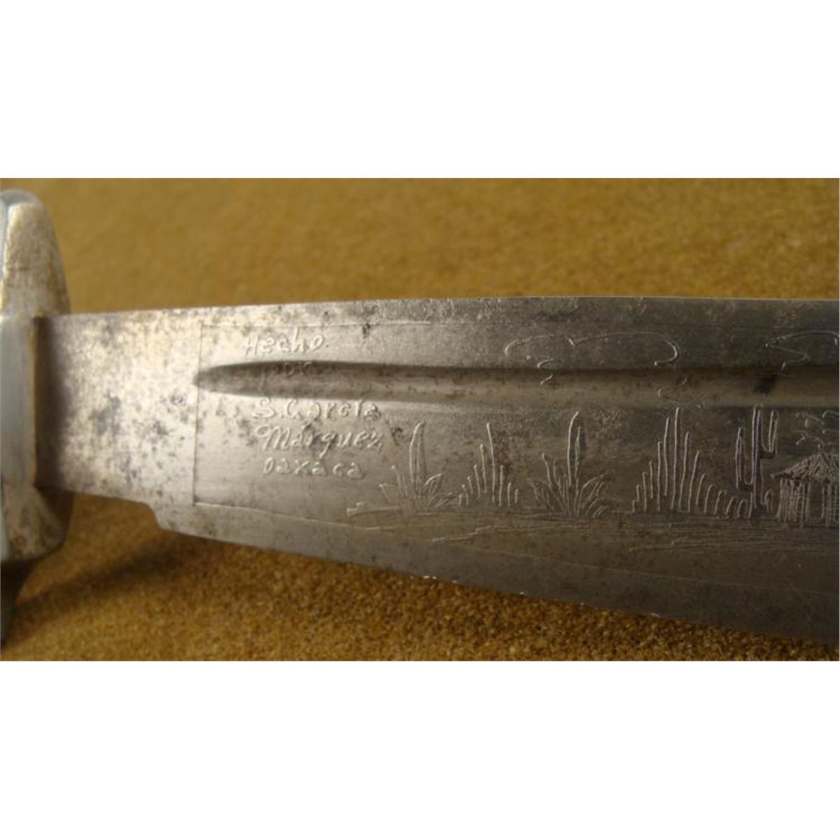 HERE IS A VINTAGE MEXICAN FIGHTING KNIFE & SCABBARD, DOUBLE ETCHED BOWIE KNIFE BLADE. * THIS IS A SUPER NICE KNIFE, WITH A LIGHTWEIGHT METAL "KNUCKLE" HANDGUARD AND HORN GRIPS. THE BOWIE BLADE IS 8 1/4" LONG. ON ONE OF THE ETCHED SIDES HAS A DESERT SCENE, CACTUS, ETC AND SAYS "HECHO POR S. GARCIA-MAIQUEZ OAXACA". ON THE OTHER SIDE, IT IS ETCHED WITH DESIGNS AND READS "SOY COMO EL VERDE PICANTE PERO SABROSO". THERE IS A SINGLE FILLER ON EACH SIDE. THE KNIFE COMES WITH A TOOLED LEATHER SHEATH, THAT HAS A SMALL RIP ON THE LOWER LEFT SIDE AND SOME OF THE STITCHING ON TOP IS STARTING TO COME UNDONE. THE OVERALL LENGTH IS 13". * *