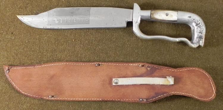 VINTAGE MEXICAN FIGHTING KNIFE-ENGRAVED BLADE-KNUCKLES HAND GUARD-BOWIE BLADEWELL MADE MEXICAN FIGHTING KNIFE--BLADE ENGRAVED ONBOTH SIDES-HEAVY BOWIE CUT BLADE--HORN GRIP INLAY--SNAKE HEAD POMMEL--FIGHTING KNUCKLE GRIP--TOOLED LEATHER SCABBARD