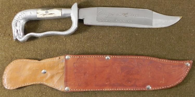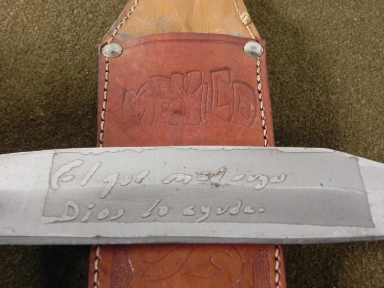 VINTAGE MEXICAN FIGHTING KNIFE-ENGRAVED BLADE-KNUCKLES HAND GUARD-BOWIE BLADE * WELL MADE MEXICAN FIGHTING KNIFE--BLADE ENGRAVED ON BOTH SIDES-HEAVY BOWIE CUT BLADE--HORN GRIP INLAY--SNAKE HEAD POMMEL--FIGHTING KNUCKLE GRIP--TOOLED LEATHER SCABBARD *