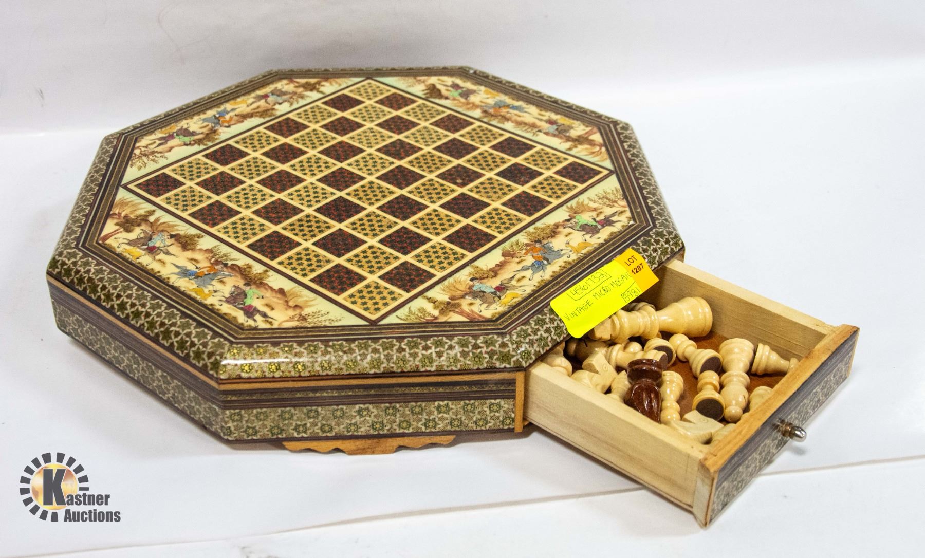BOARD WITH DRAWER WITH CHESS PIECES MADE OF WOOD **ALL ITEMS MUST BE REMOVED BY 5PM SATURDAY, SEPTEMBER 28TH 2024. ALL REMAINING ITEMS WILL BE SUBJECT TO A $6.00 PER DAY STORAGE CHARGE. ANY ITEMS REMAINING AFTER MONDAY, OCTOBER 14TH 2024 WILL BE CONSIDERED FORFEITED. NO REFUNDS WILL BE ISSUED FOR FORFEITED ITEMS. TO SCHEDULE A PICK UP APPOINTMENT CLICK HERE