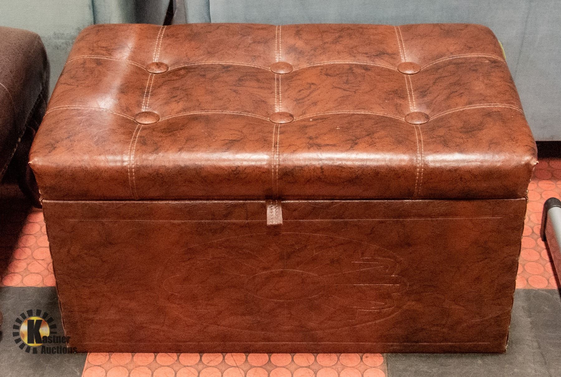 EMBROIDERED TUFTED HOBNAIL VINYL AND SOLID WOOD HINGED. 29" X 17" X 15" **ALL ITEMS MUST BE REMOVED BY 5PM SATURDAY, APRIL 15TH 2023. ALL REMAINING ITEMS WILL BE SUBJECT TO A $6.00 PER DAY STORAGE CHARGE. ANY ITEMS REMAINING AFTER MONDAY, APRIL 30TH, 2023 WILL BE CONSIDERED FORFEITED. NO REFUNDS WILL BE ISSUED FOR FORFEITED ITEMS. TO SCHEDULE A PICK UP APPOINTMENT CLICK HERE
